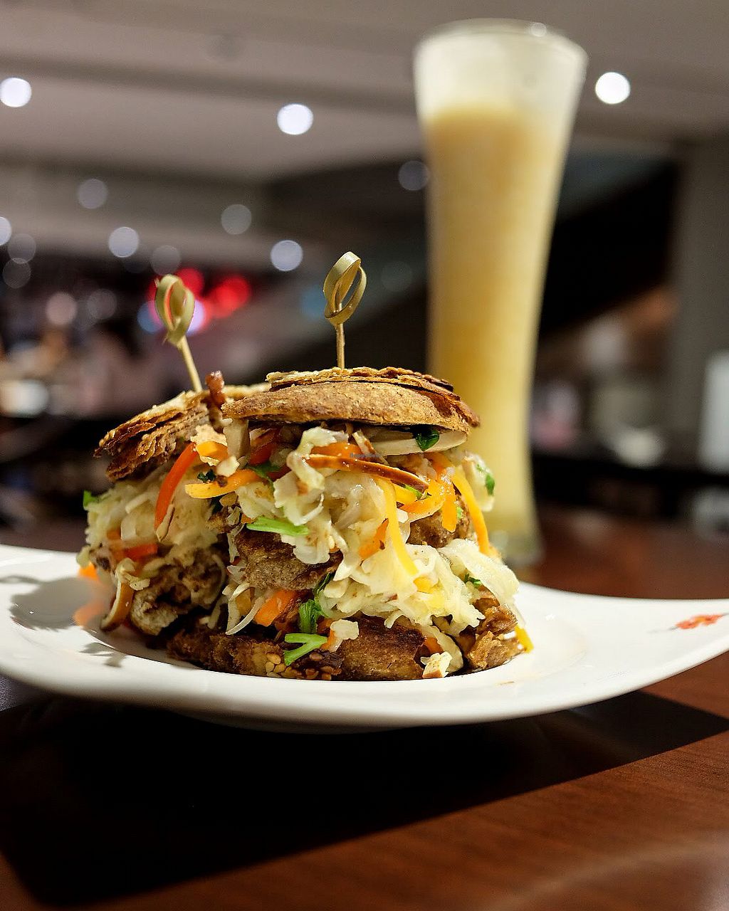 The most interesting dish I’ve tried is the Chinese burger. It uses pickled veggies, soy sauce tofu strips, a braised tofu slice, carrot and parsley. The bread has a texture like Indian flaky flatbread. The taste is closer to an appetizer because of the pickled veggies. Unique and delicious.
