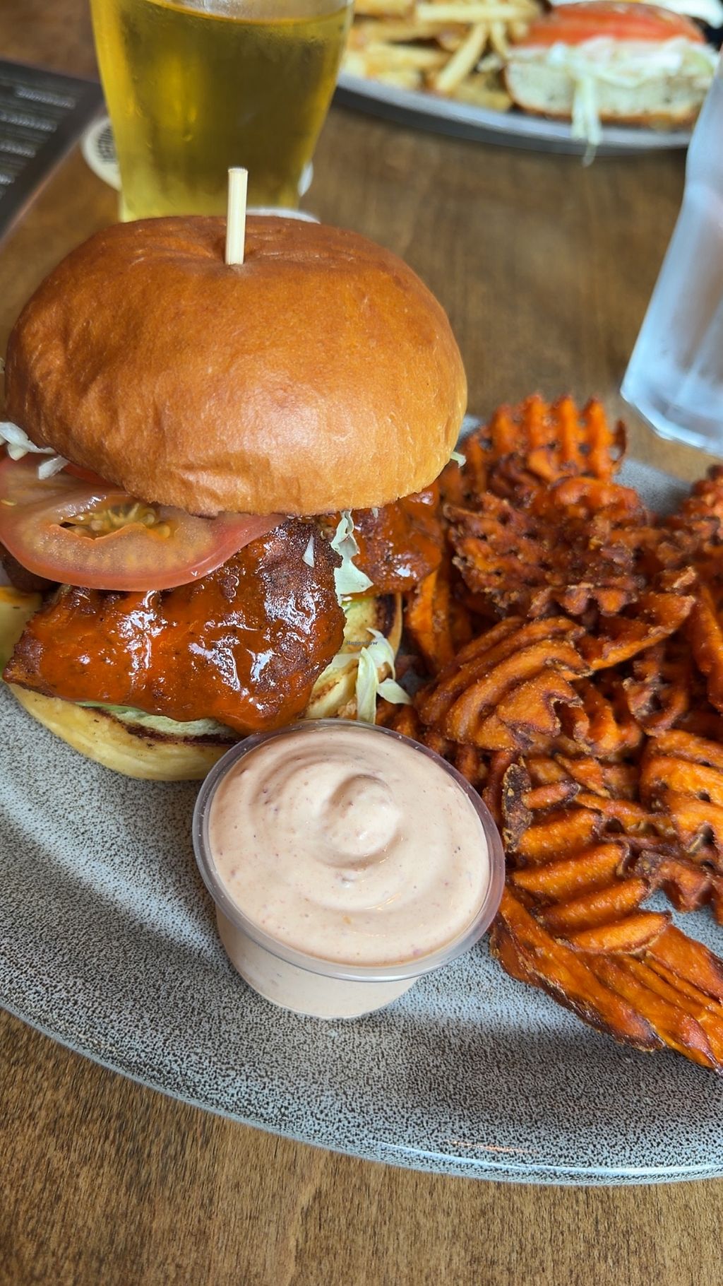 I got the buffalo cauliflower sandwich with sweet potato fries. Not much is labeled vegan but upon asking our server she verified it was vegan.