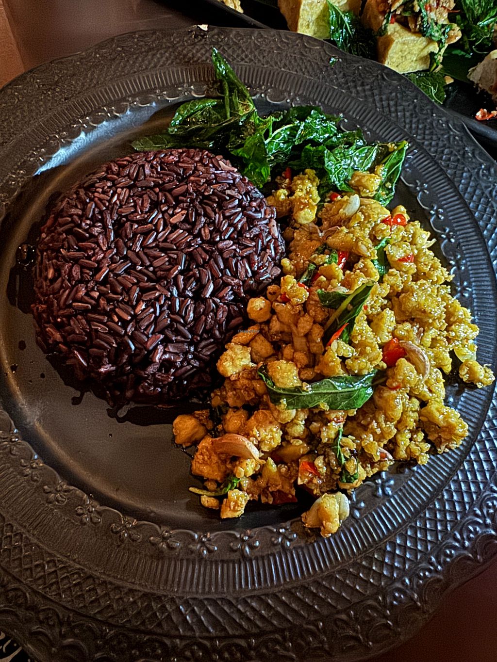 Well worth finding this lovely place. It has become our favorite. With so many delectable options on the menu, choosing was a challenge! For now had to find and open it on a mobile phone, then scroll through and by the time you get to the end you forget what it was at the beginning. Fortunately the staff makes helpful sensible recommendations. Some of our favorite dishes are the amazing Banana Blossom salad, one of the best vegetarian Kaosoi anywhere, Freshly grilled lion's mane mushrooms on a skewer, Melinjo leaves with tofu, great burgers, unique pizzas, black rice berry either fried with plant-based meat or with any of their wonderful curries.. not forgetting to mention there's really a nice music Soul R&B carefully Selected In a soft Cozy atmosphere. And best of all now they're open until midnight every day! One of the only Vegan places open late.