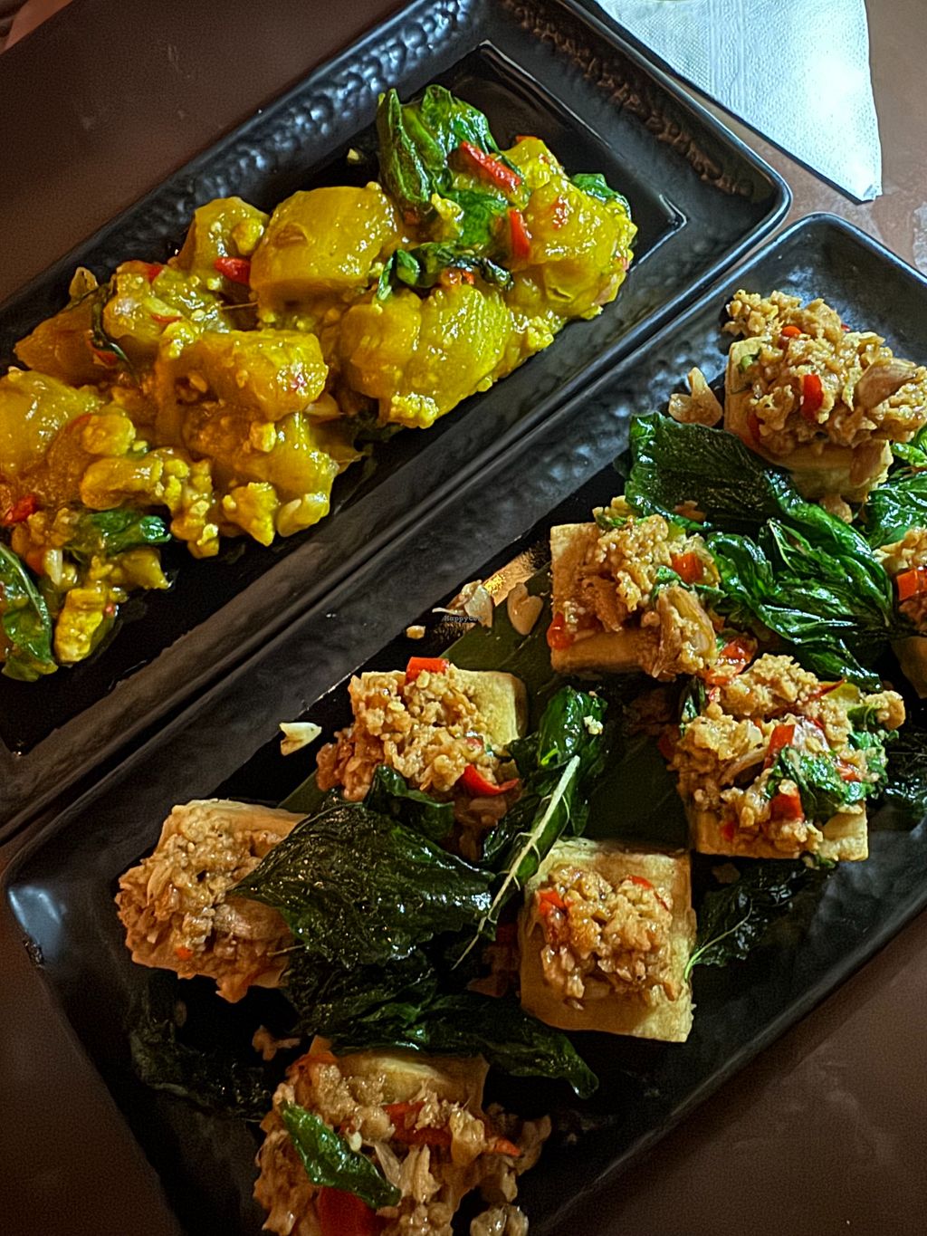 Pros: Atmosphere & Ethos , Kraprao Minced Meat Stuffed Tofu, Battered Banana Leaves