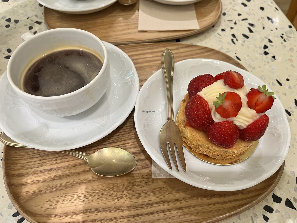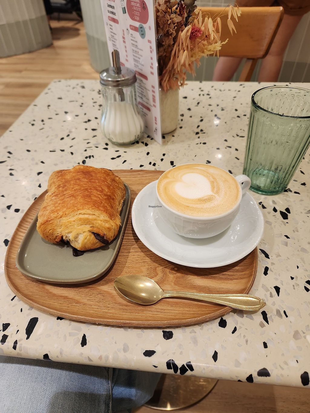 Lovely cafe, has croissants, pain au chocolate, and many other pastries. Milk is default oat but they also have soy and coconut. Love and appreciate an all-vegan bakery.
