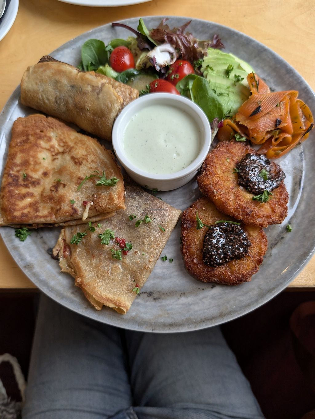 This is a fully vegan restaurant. Most of the menu can be considered as fast food. We had cauliflower, gyros, mushroom burger and spring rolls. Fried food was nicely fried not soaked with oil. Kombucha options are wide. Within the developing scene of Riga for vegans, this place is an excellent option.