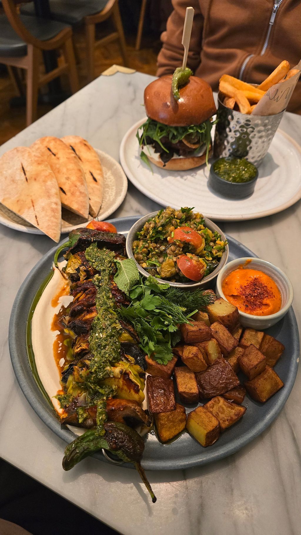 Ate here 3 times! The red pepper romesco I crave all the time - it’s perfection. Olive pickle mix slaps. There was a beetroot dip at the time that was amazing — and we had a couple different curry dishes with rice. Plating was a vibe - everything looked and tastes amazing. Great variety on their menu - every time I ate was hard to choose!! Have to go back a couple times to try everything but I HIGHLY recommend the Romesco!! 🤌🤌🤌