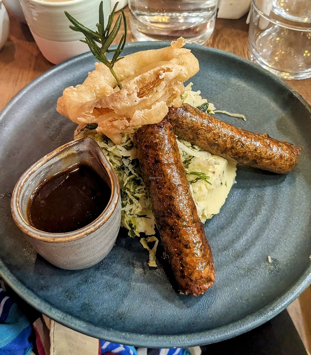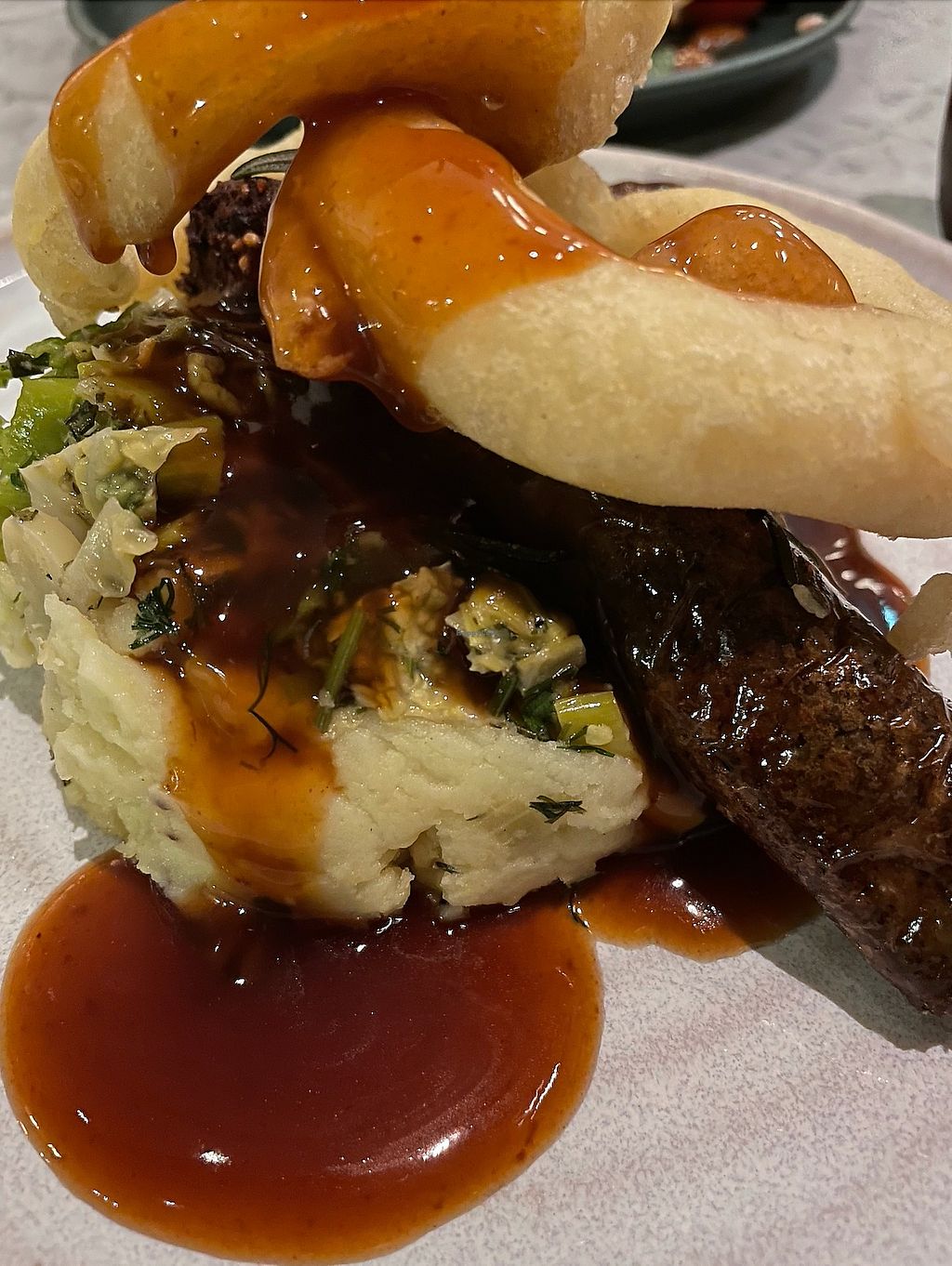 Cumberland sausages with mash and creamy leaks with red onion gravy an…