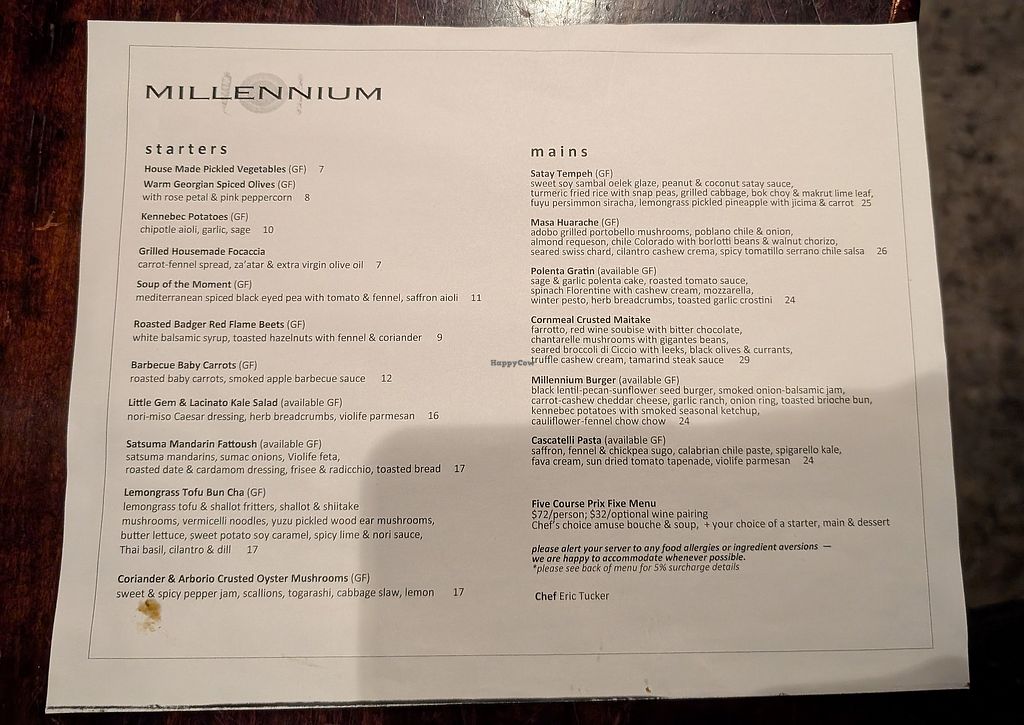 My last review for millennium was in 2018 so high time for an update. The food here is excellent. My favorite remains the coriander crusted. fried mushrooms, which are so delicious. I also love the little gem salad. The entrées are good as well, but a bit pricey. Also be aware that they add about 5% onto your bill automatically, but that is not the tip. I believe one percent goes to a food bank and 4% is for increased costs. It’s definitely worth the splurge.