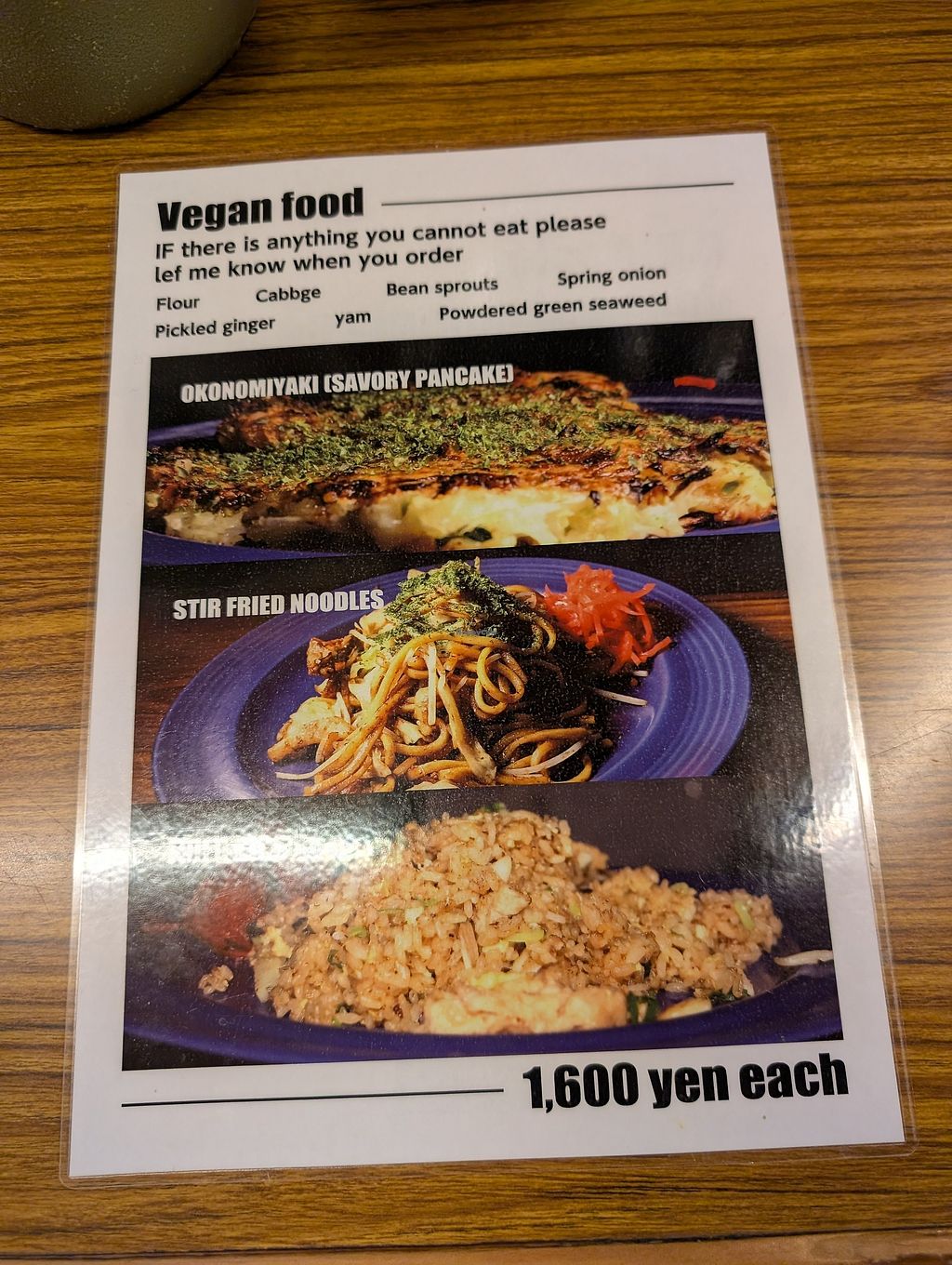 the owners were so friendly! I asked them for a special vegan menue and she gave me a vgn menue. That includes 3 dishes. I have choosen the okonomiyaki, it was delicious!