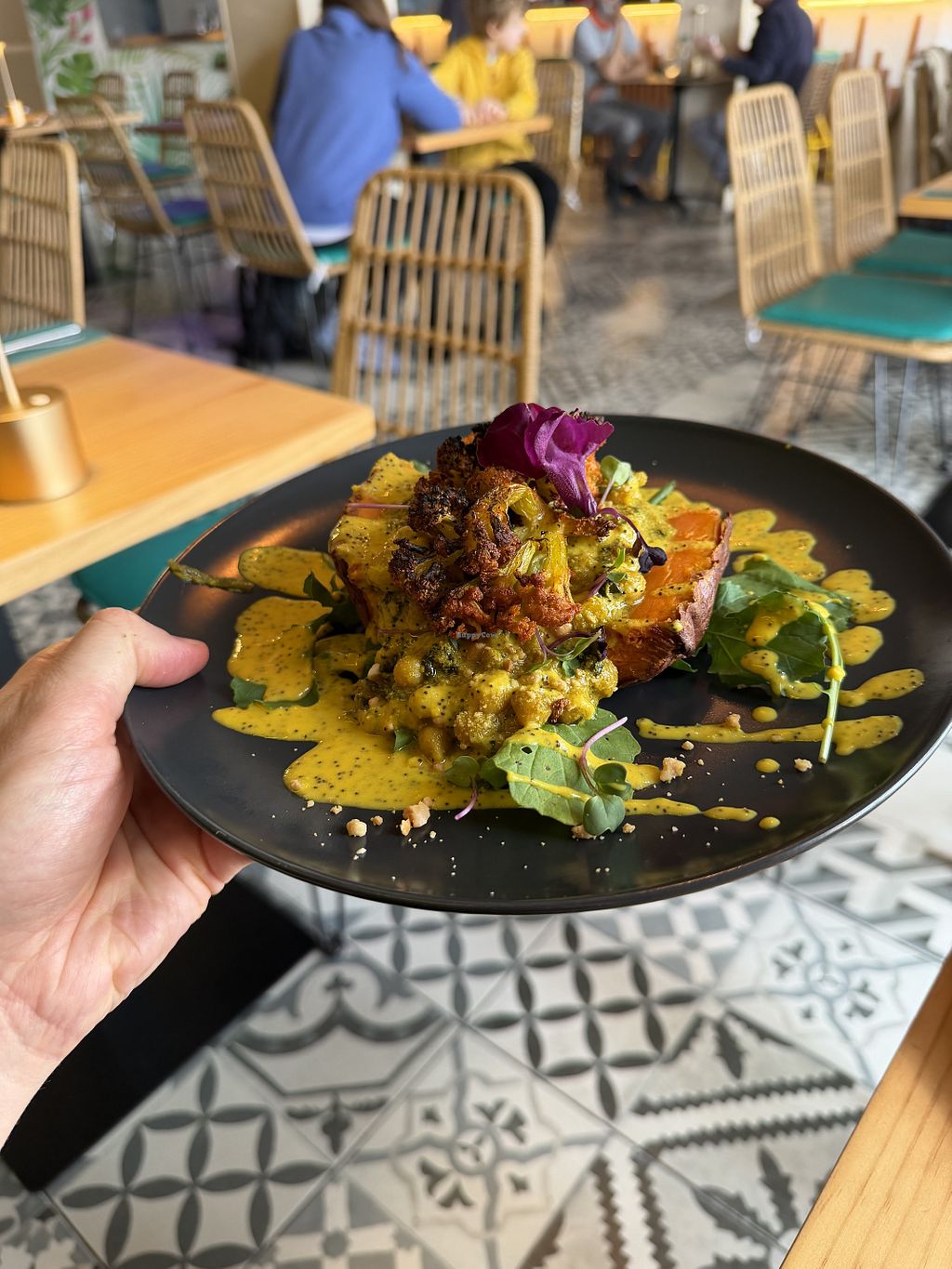 Menu is by QR code, which I dislike, but there is an English version. My cocktail seemed to take longer than necessary to arrive. I chose the Papa Magica: yam with chickpea curry with cauliflower. Flower garnish; attractive presentation. Creative dishes. Healthy food.