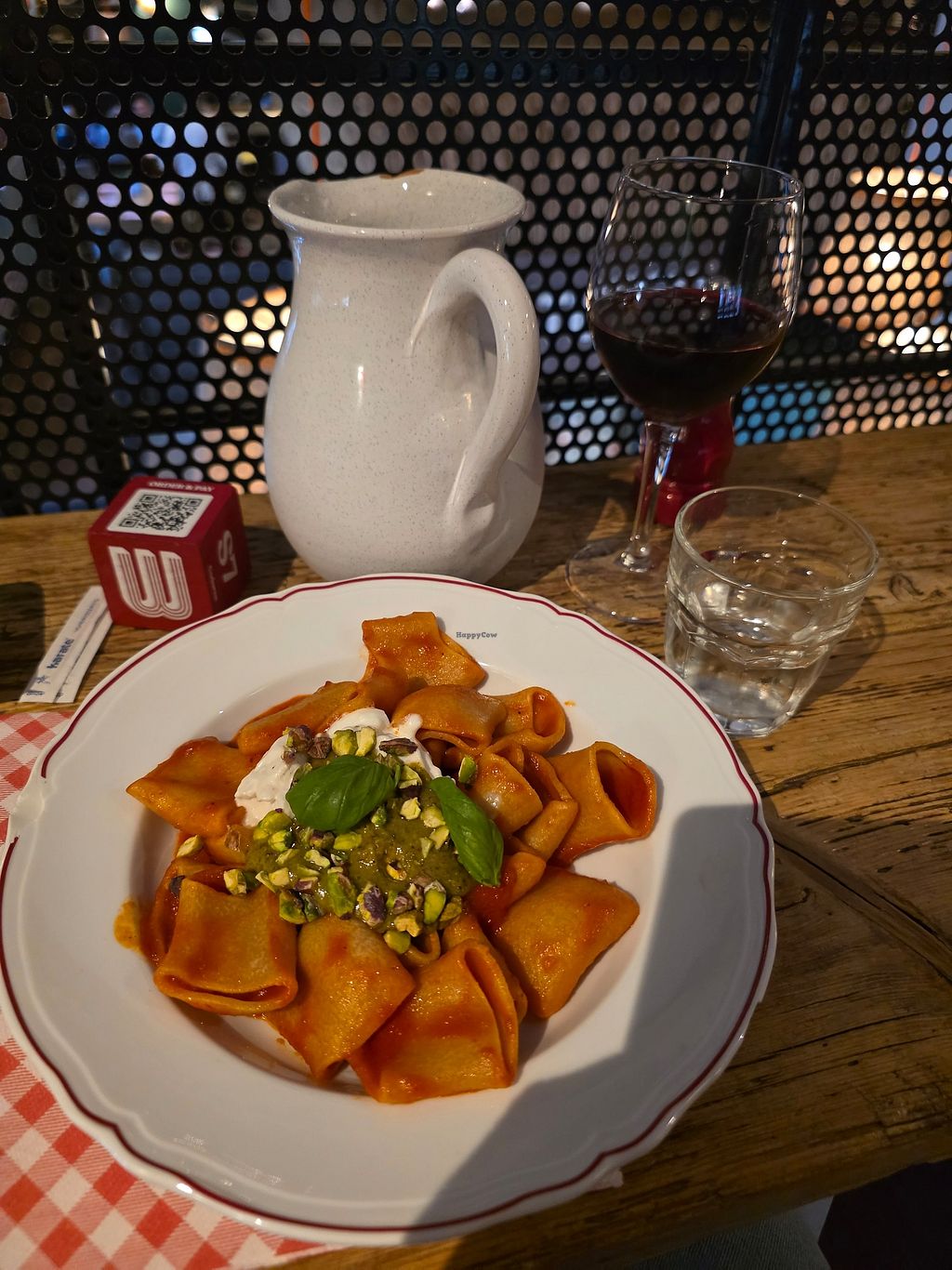 Really tasty and well thought out. There are two main options on the menu it was hard to decide which one to go with. Amazing value for money. Sparkling water, glass of red wine, olive and pasta came in at €19.
