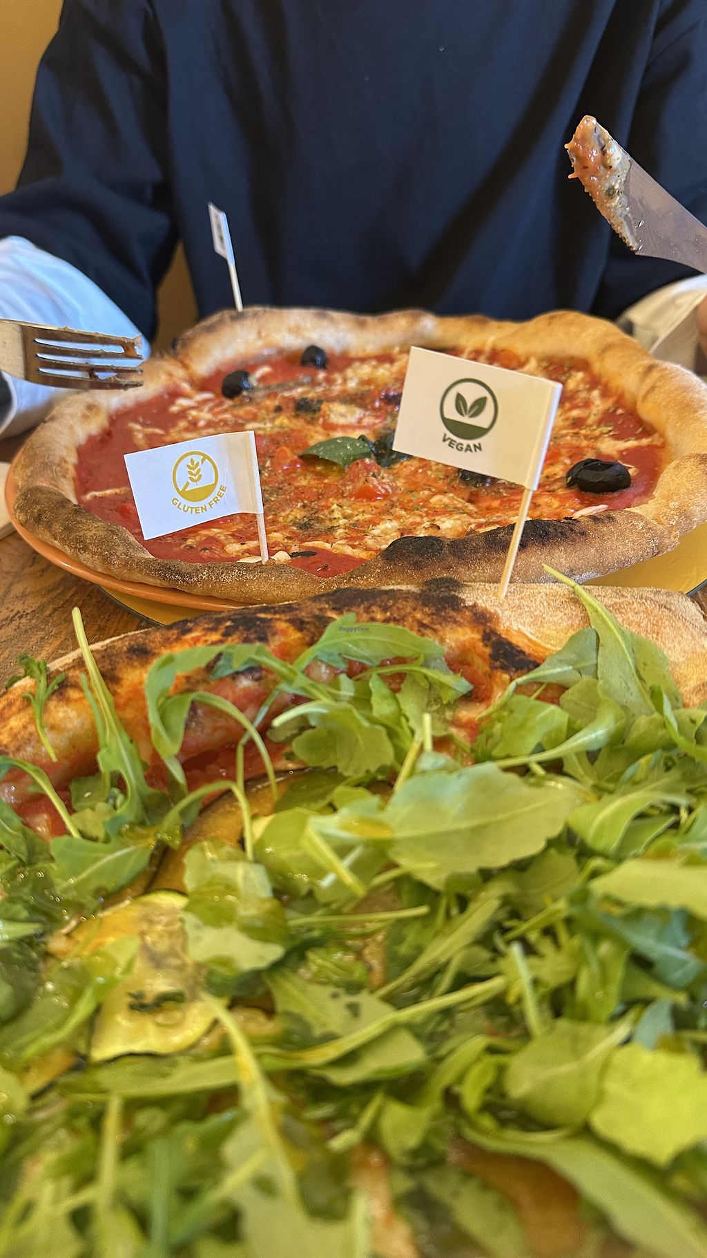 Pizzas vegetarianas con opción a queso vegano. También masa gluten free. Es un sitio barato en la plaza del Duomo donde comer una pizza sabrosa desde 10/12€ (suplemento 2€ queso vegano) muy recomendable. Servicio rápido y vegan friendly 🌱