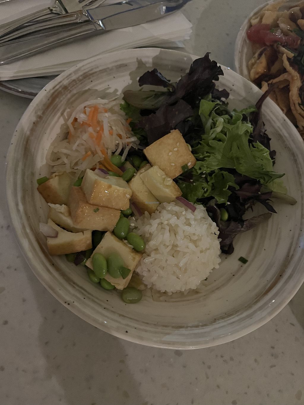 2 listed vegan options (edamame and salad). Both were okay. My salad came with a hair in it but they replaced it. Nice location by beach.