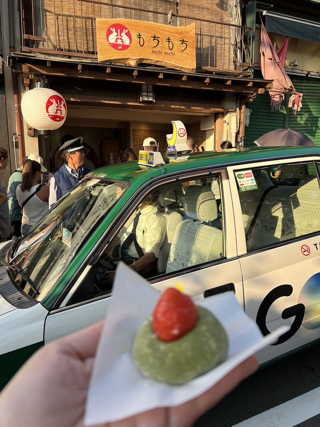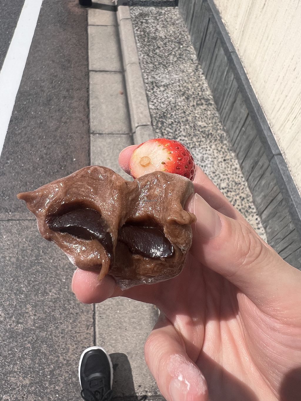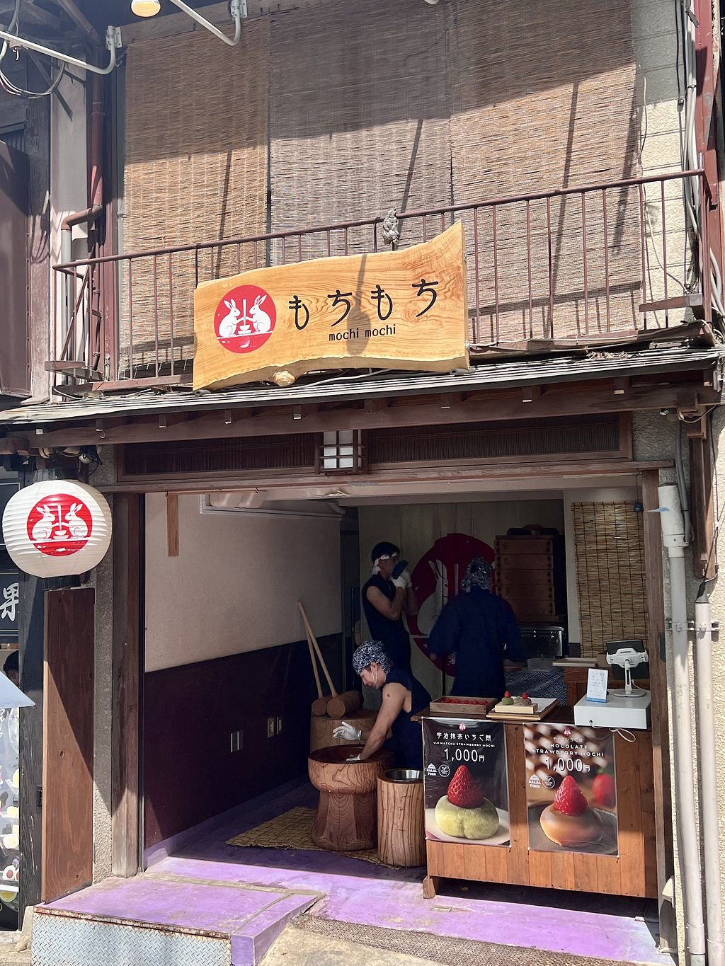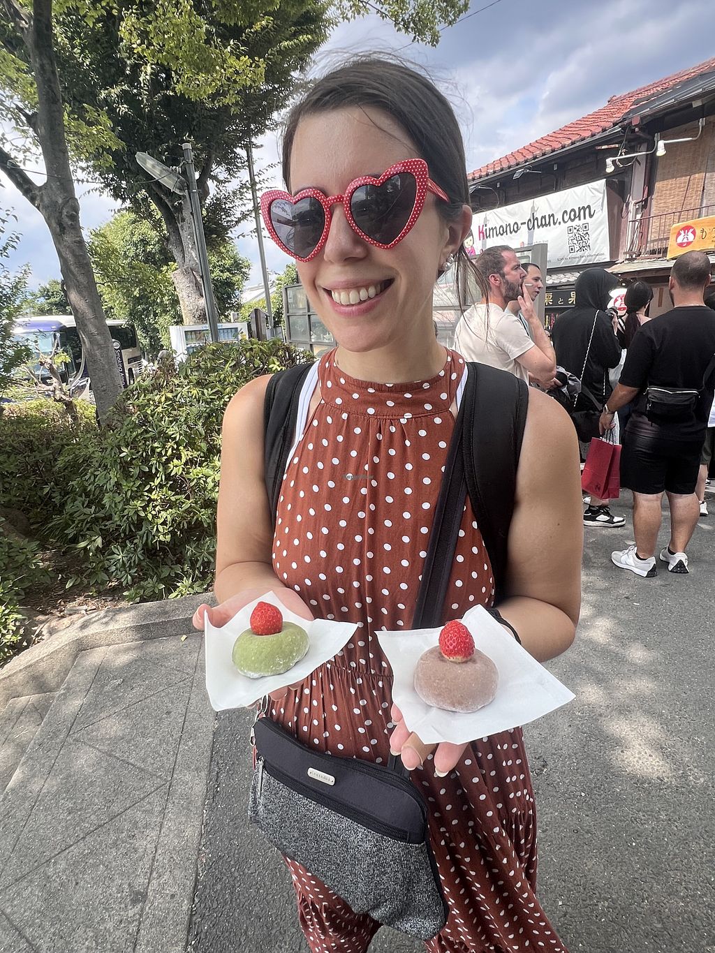 What a fun experience! We got to see the workers hand-making the mochi, which is all vegan and comes in two flavors — matcha and chocolate, both with a strawberry on top. We got one of each and devoured them — some of the best bites of our time in Japan!