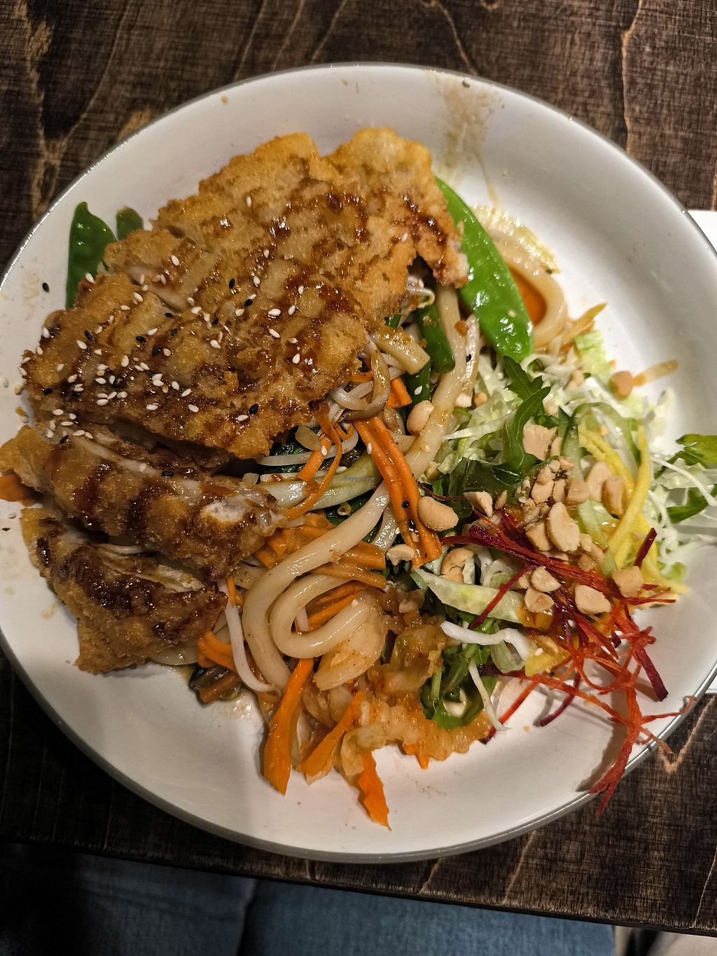 Everything came with great kimchi, super-fresh greens, and purple rice. Proteins were crisp, which is nice too.