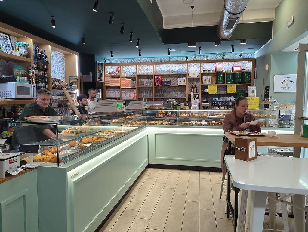 Serves meat, vegan options available. Simple Italian deli offering vegan pizza, arancini and desserts. Open Mon-Sun 08:00-22:00.