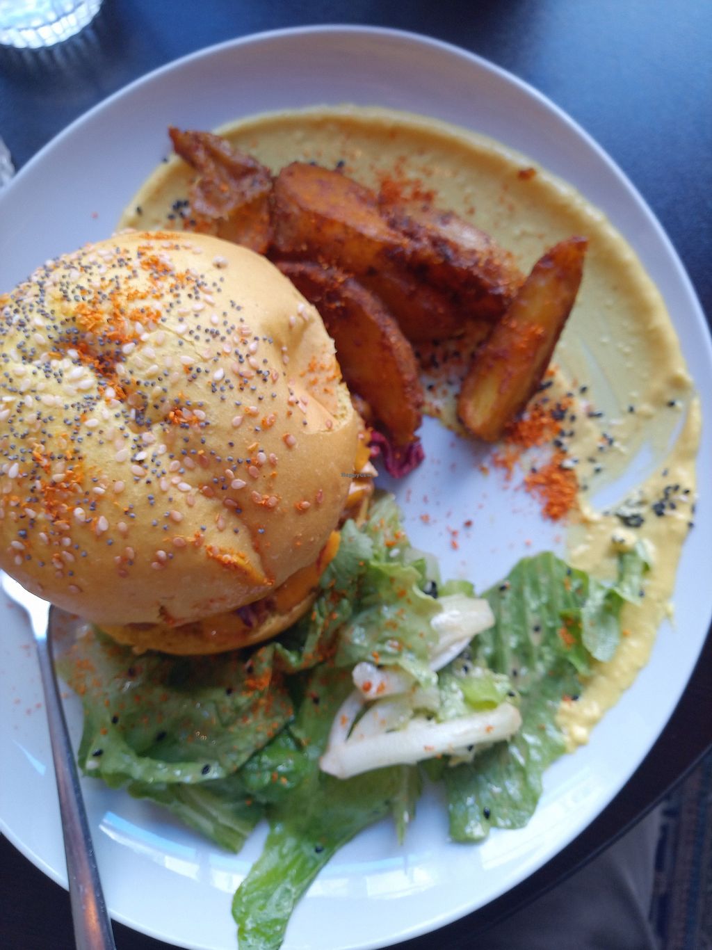 Das essen ist ok. Der Jackfruit Burger war klasse. Die Jackfruit Starter mix Nacho's waren es auch. Insgesamt stimmt das Preis Leistungs Verhältnis.