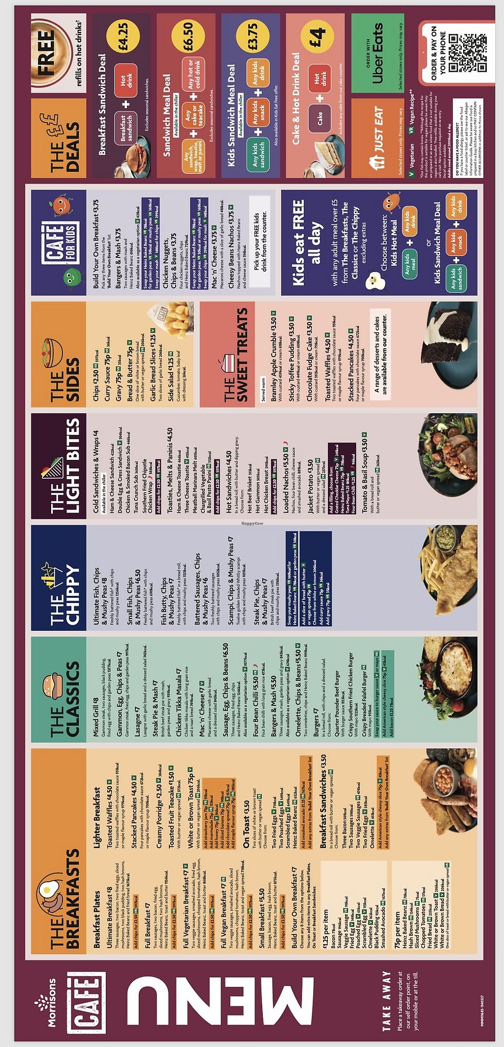 Serves meat, vegan options available. Café located inside Morrisons Supermarket. Offers clearly labelled vegan items including a full vegan breakfast, vegan sausage breakfast sandwich, sweet potato curry and jacket potato with baked beans. Open Mon-Sat 08:00-18:00, Sun 09:30-16:00.