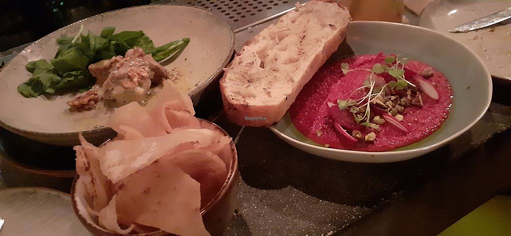 Serves meat, vegan options available. Encourages shared dining experiences. Has vegetarian menu section with vegan options marked. These include quinoa, avocado and risotto, and a dessert. Open Tue-Sun 6:30pm-10:30pm. Closed Mon.