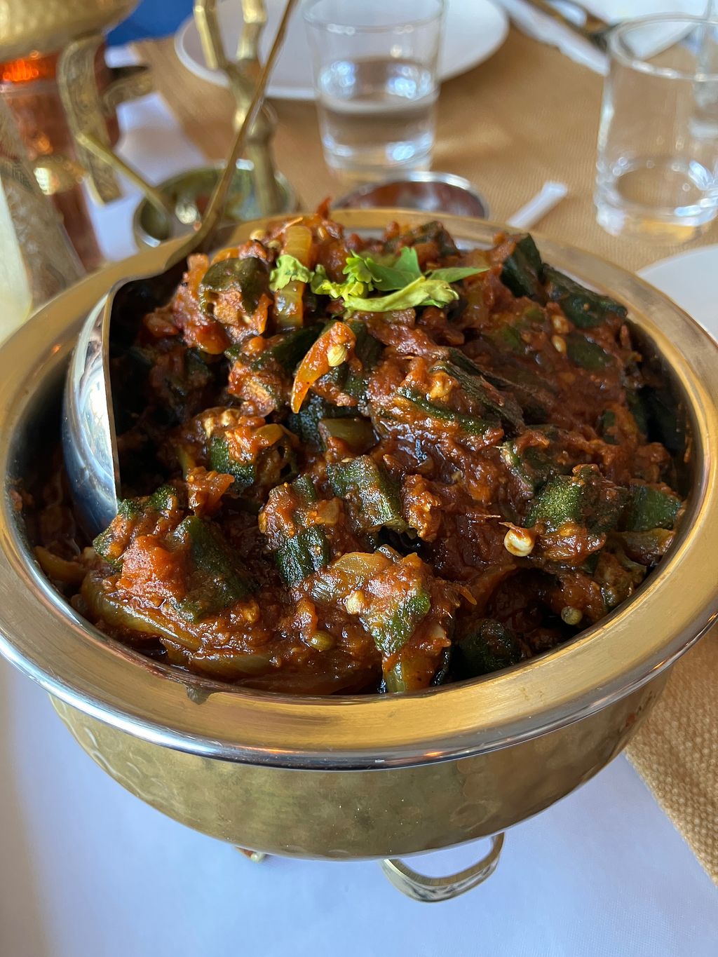 Mr & Mrs Singh Kitchen is a new East Indian restaurant on 124 St. The menu has a vegetarian section that includes clearly marked vegan and gluten free items. The restaurant itself is more upscale than other Indian restaurants in the area. The decor is elegant and the tables are decorated with cloth table cloths, cloth napkins in brass napkin rings, a candle, and brass vases with a fresh flower. The service was swift and friendly. We ordered the Baingan Bhaji and Bhindi Masala. The menu said both dishes came with rice pilaf or naan, but the sever told us that only the rice was vegan. Servings were large and in decorative copper serving dishes on little trivets with warming candles. The Baingan Bhaji was lovely soft smoky eggplant that was everyone’s favourite. The Bhindi Masala was also very tasty. We ordered our meal at a medium spice level, but the food was extremely mild. I haven’t had a mango lassi before so I don’t know how to judge them, but it was a tasty milky mango drink which served nicely as a dessert since they did not have a vegan dessert on the menu.
