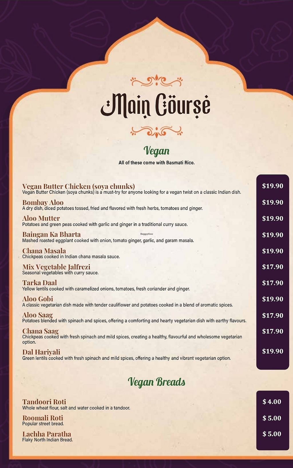 Serves meat, vegan options available. Indian restaurant offering clearly marked vegan dishes such as vegan butter chicken with soy chunks, bombay aloo, aloo mutter, chana masala, tarka daal and aloo gobi. Open Mon-Thu 4:30pm-9:00pm, Wed-Sun 12:00pm-2:30pm, Fri-Sat 4:30pm-9:30pm, Sun 4:30pm-9:00pm.