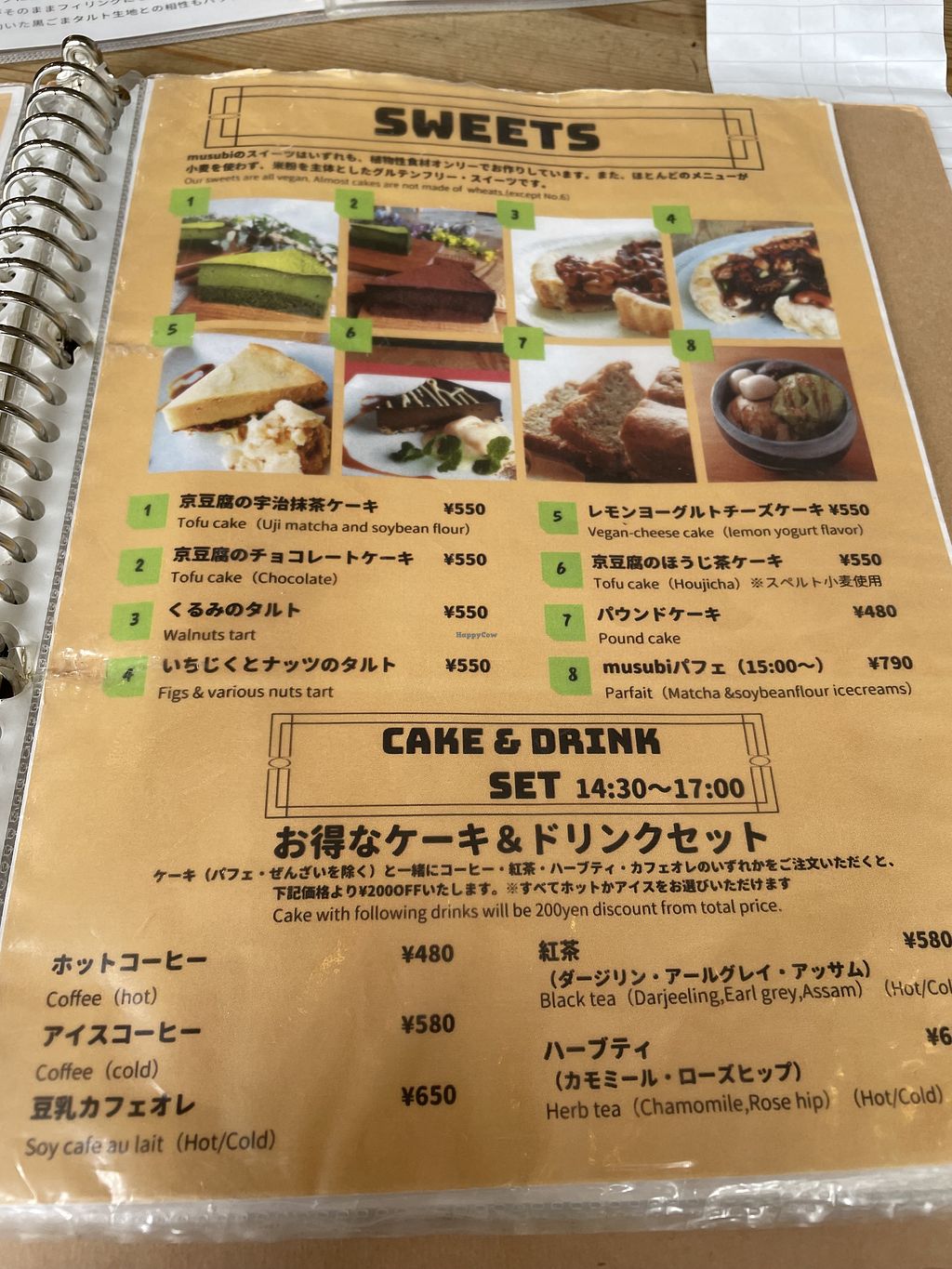 I ordered coffee and a couple of cakes, so my review does not cover the meals Musubi offers. The staff is very friendly and the location offers a much-needed reprieve from the tourist-infested area (Arashiyama) nearby. Some of the cakes are seasonal while others seemed fixed, and the two I ordered came with a little bit of vanilla ice cream and berries. The cakes are wonderful. I'm afraid the coffee wasn't that good and was also rather overpriced in my opinion.