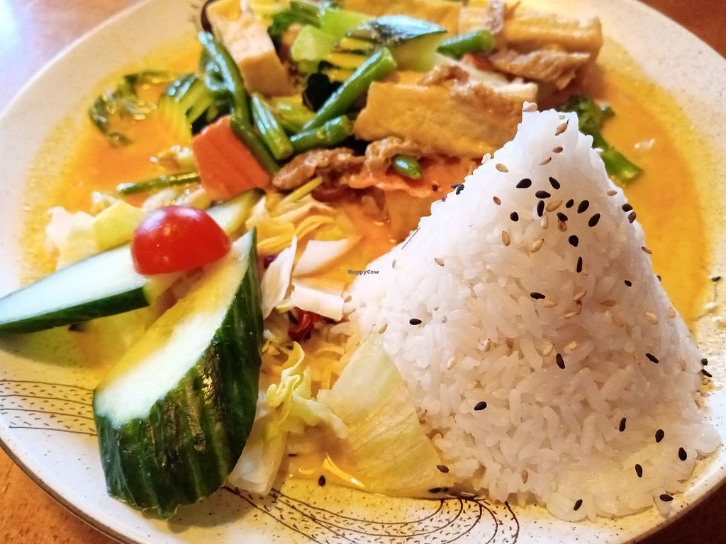 The restaurant offers 3 business lunch options under 10 Euro during the week. Two of them were vegan. I had the Mango curry and it was a good choice.