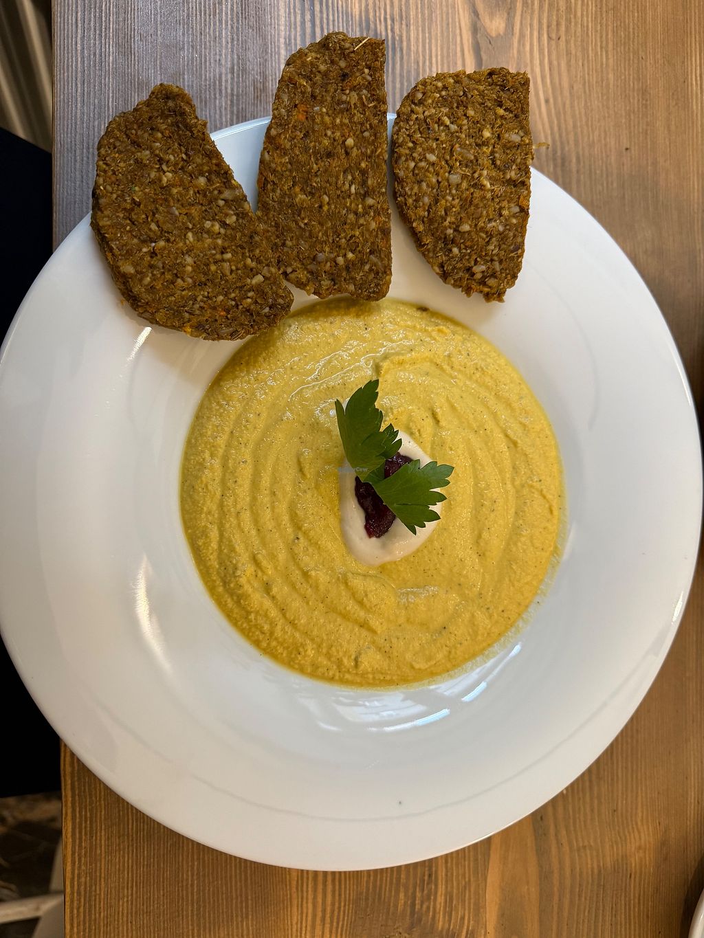 One of the best restaurants for me in Praha. Lovely place where you can try the best raw vegan desserts And the soups...delicious. great healthy drinks. Always nice music on😄❤️🎉🥕🙏
