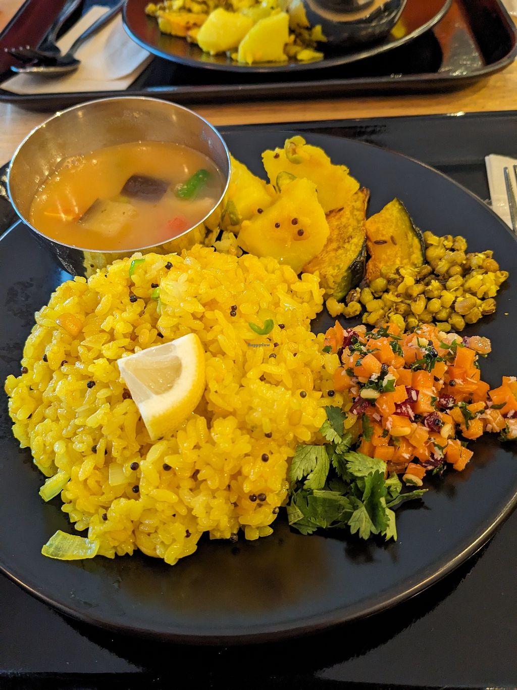 Small vegetarian restaurant specializing in Indian cuisine. Menu includes vegan capsicum rice plate and coriander rice plate, chana masala and more. Plant-based milk alternatives available. Reported open January 2026. Open Mon-Sun 11:00am-6:00pm.