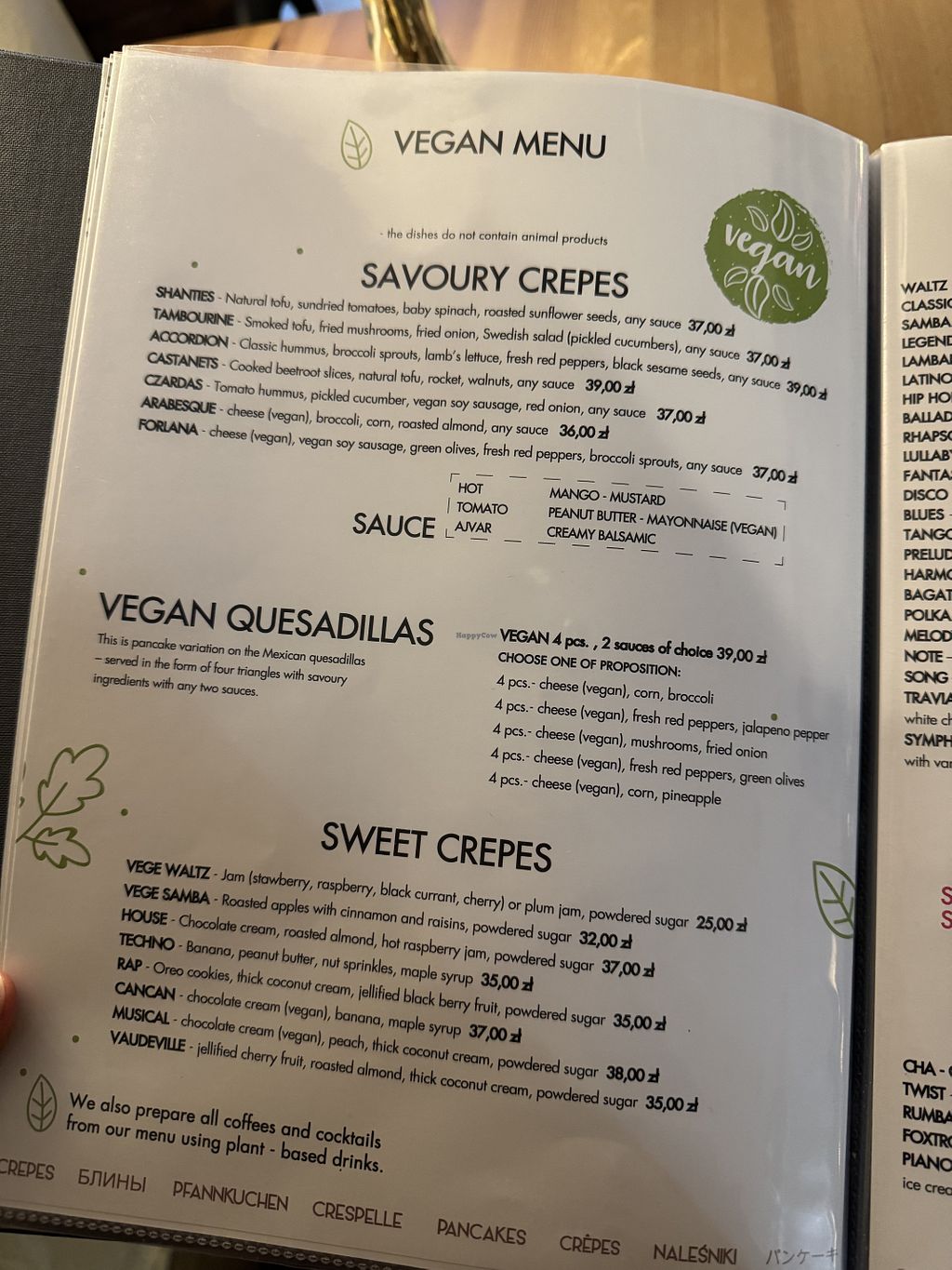 There's a lot of sweet and savory crepes, some sweet and savory pancakes, a separate list of vegan crepes (five sweet and five savory) and dips to go with it. However some of them seem like someone just threw a bunch of ingredients together... I can recommend the "czardasz" for example but the "tamburyn" is missing a sauce or something to pull it together.