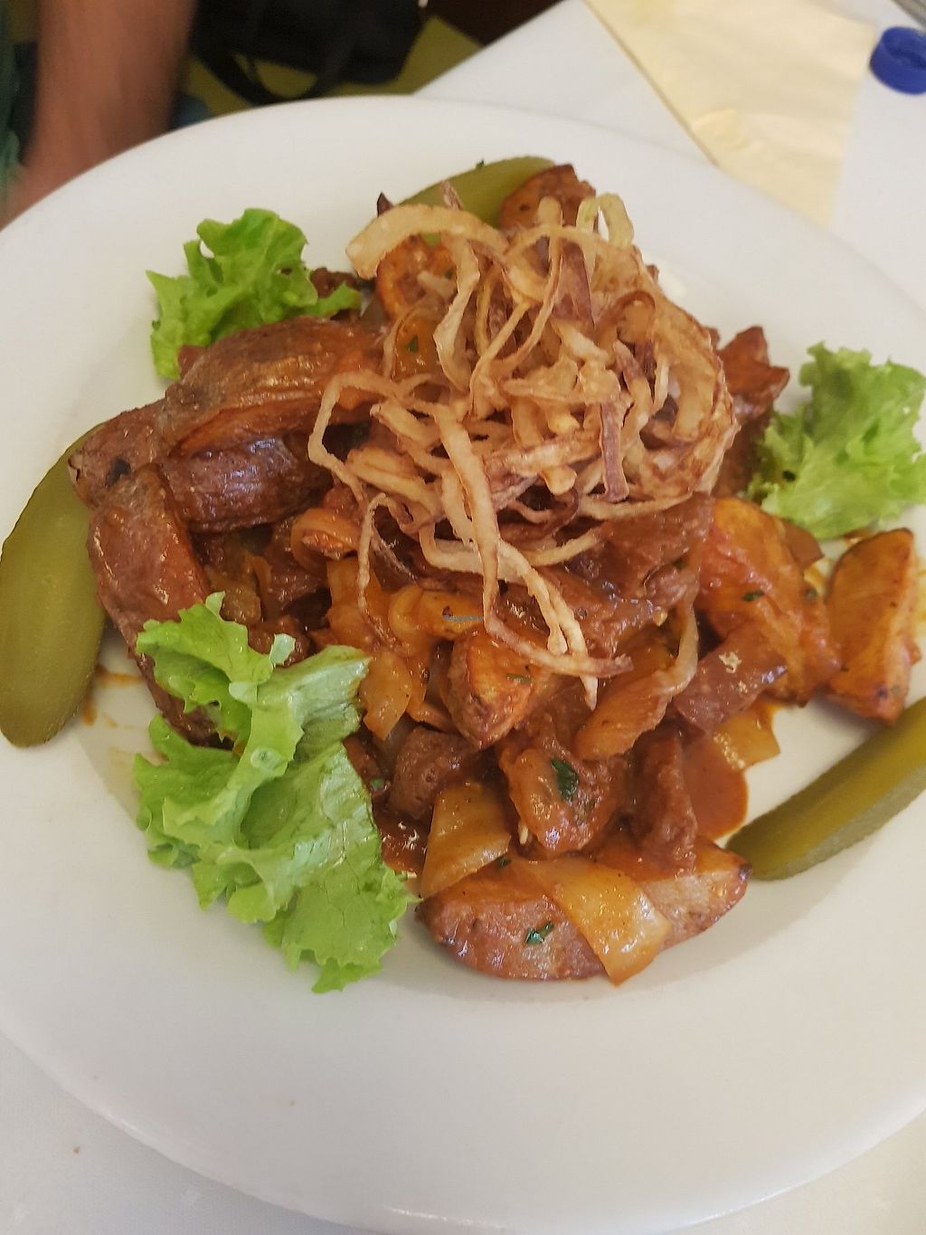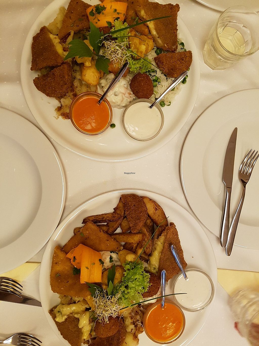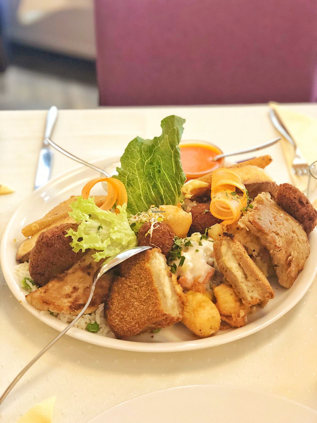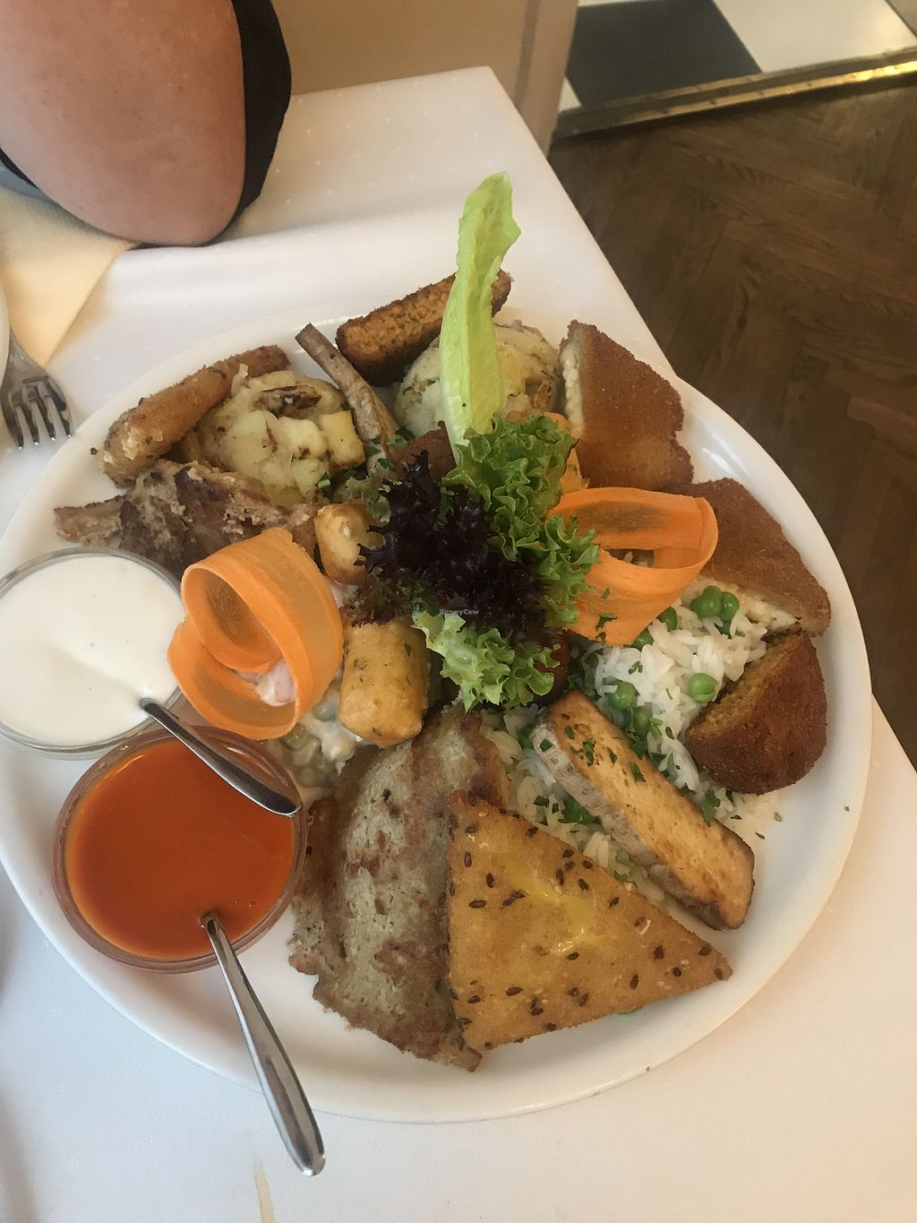 Grill platter with sweet potatoes and roasted red pepper sauce. DELICI…