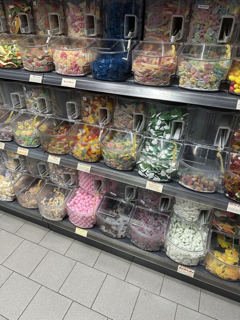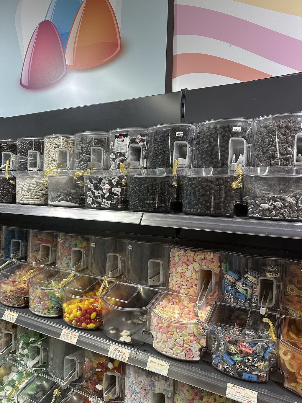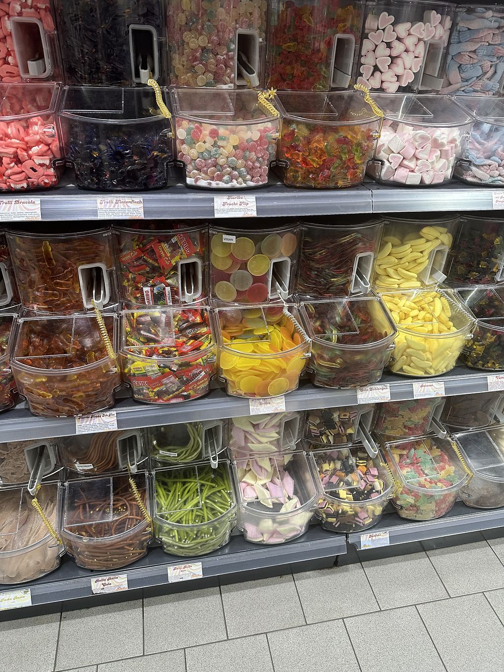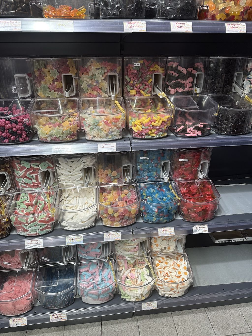 There is a good selection of vegan gummy bears. The vegan varieties are clearly labeled at the self-service counter. However, the gummy bears look as if they have been sitting there for a long time (dry, hard).