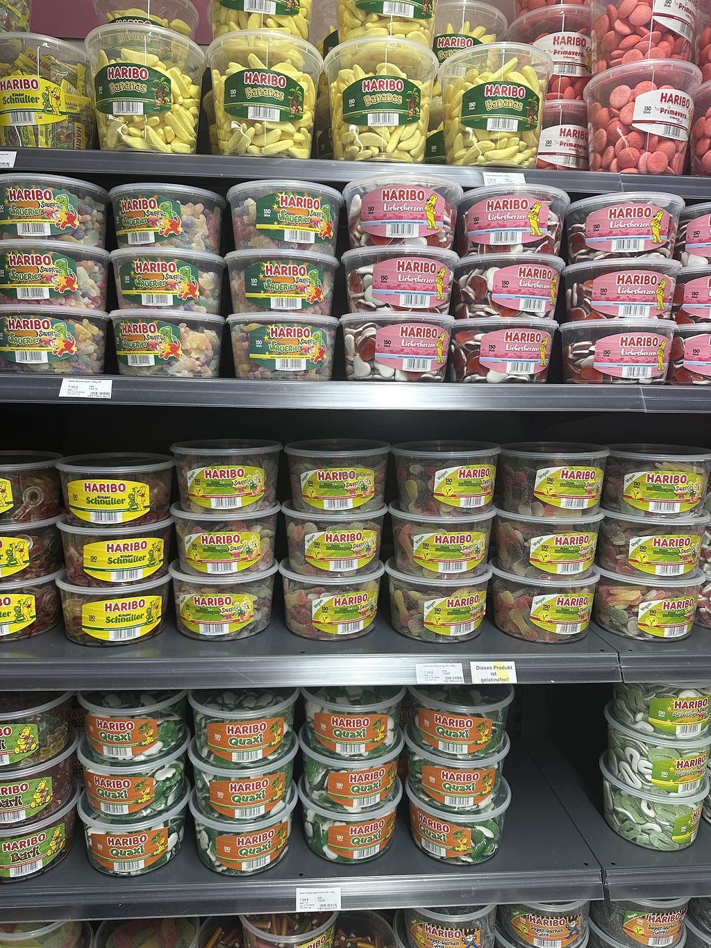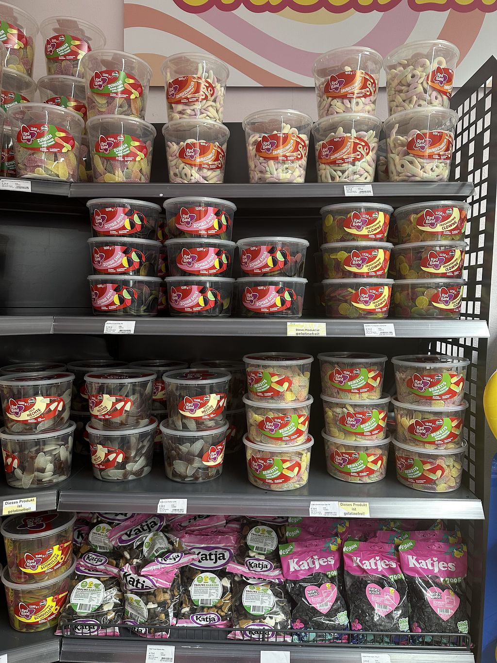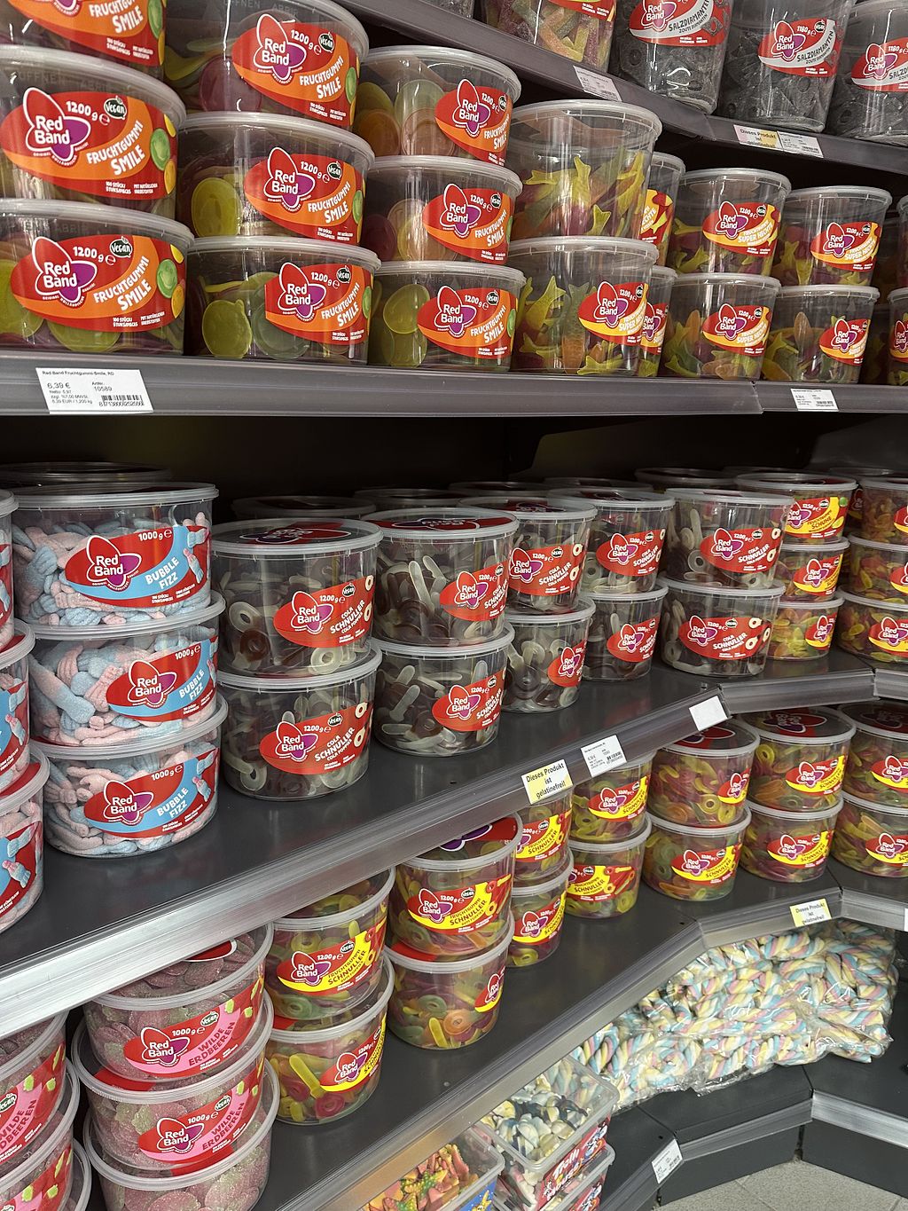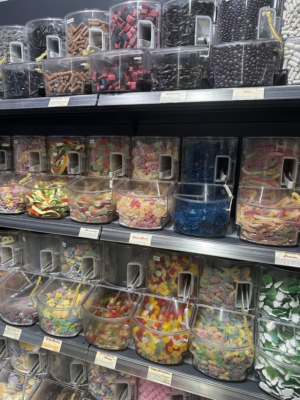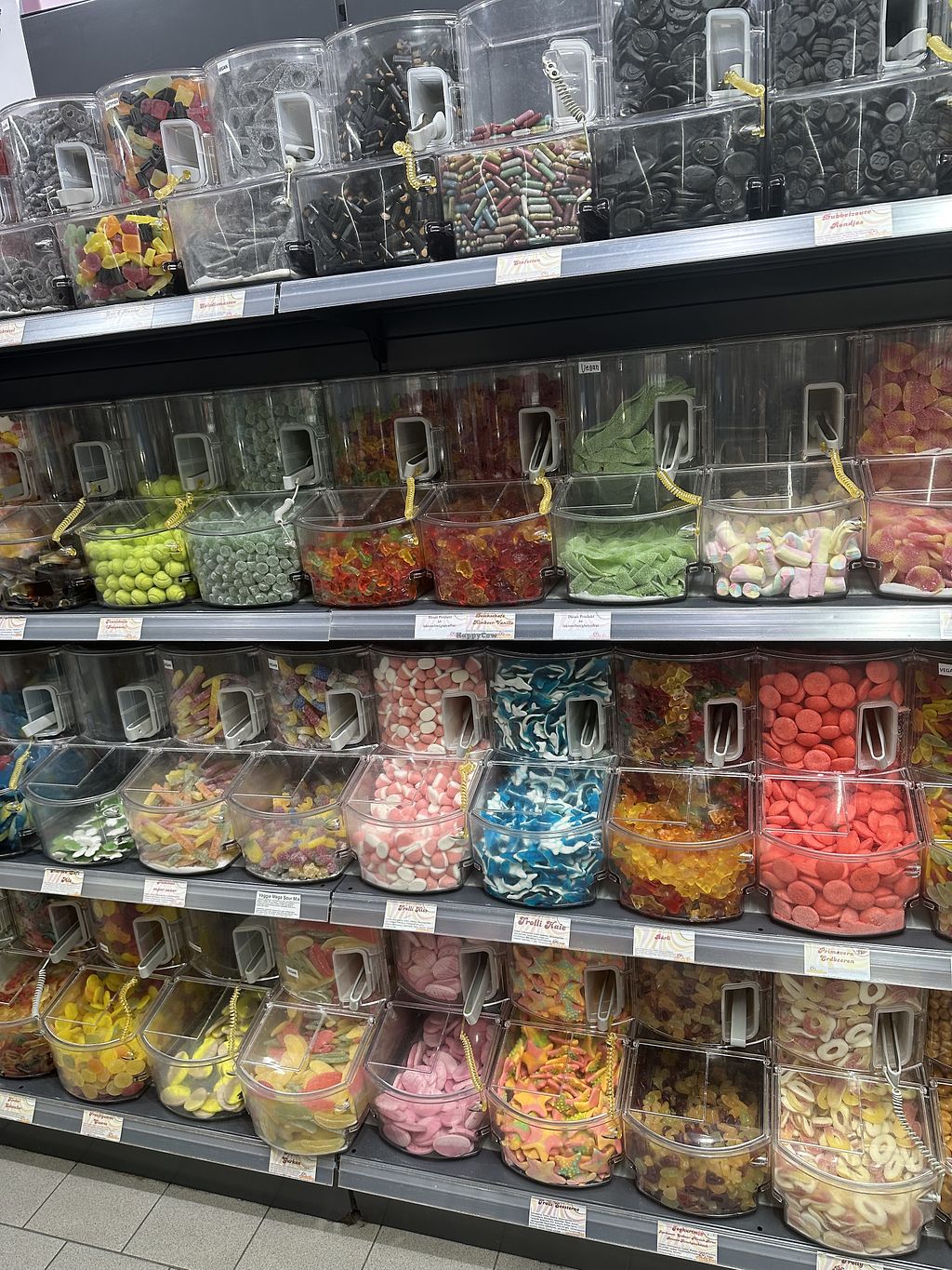 There is a good selection of vegan gummy bears. The vegan varieties are clearly labeled at the self-service counter. However, the gummy bears look as if they have been sitting there for a long time (dry, hard).