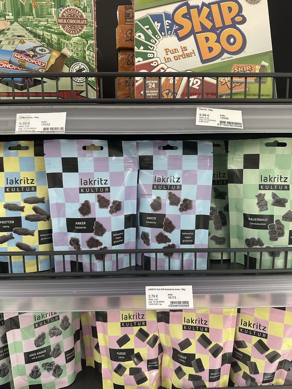 A shop with a large selection of clearly labeled vegan sweets plus a whole vegan shelf. Open Mon-Sat 10:00-19:00. Closed Sun.