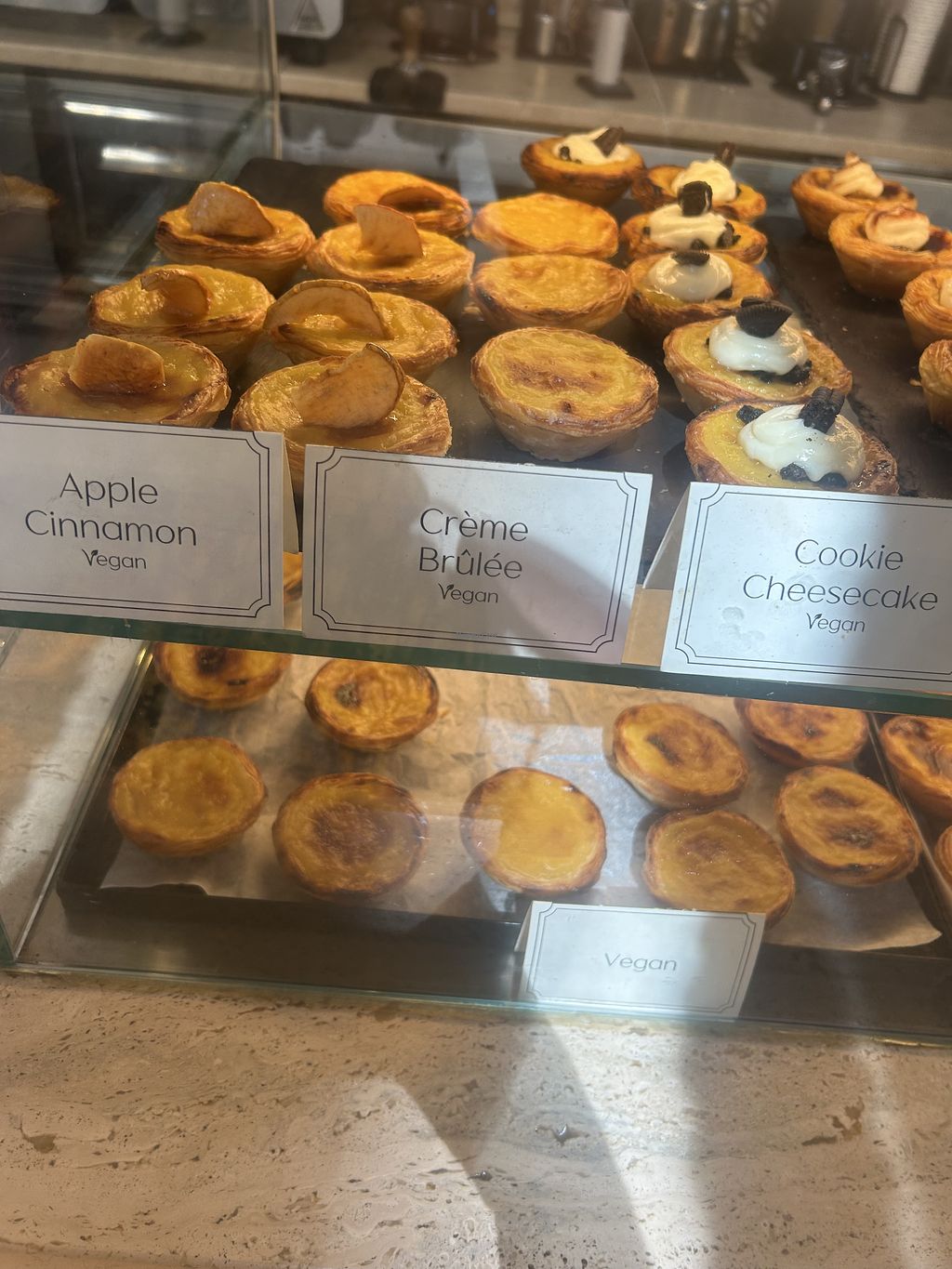 I'm so glad I got to try vegan pasteis de nata! They were delicious. They had clearly labeled vegan options (traditional, crème brûlée, cookie cheesecake, apple cinnamon). They also have plantmilk for drinks.