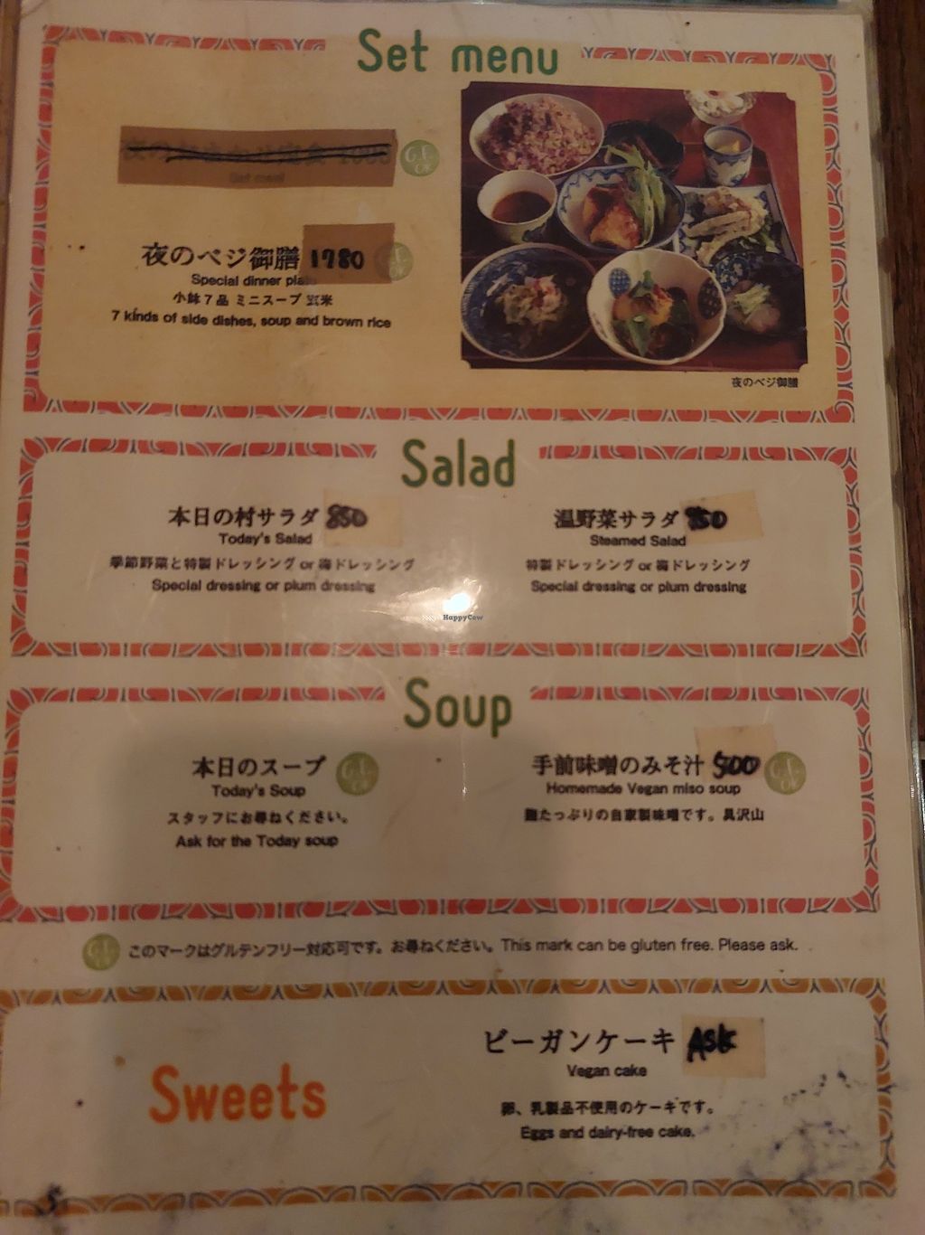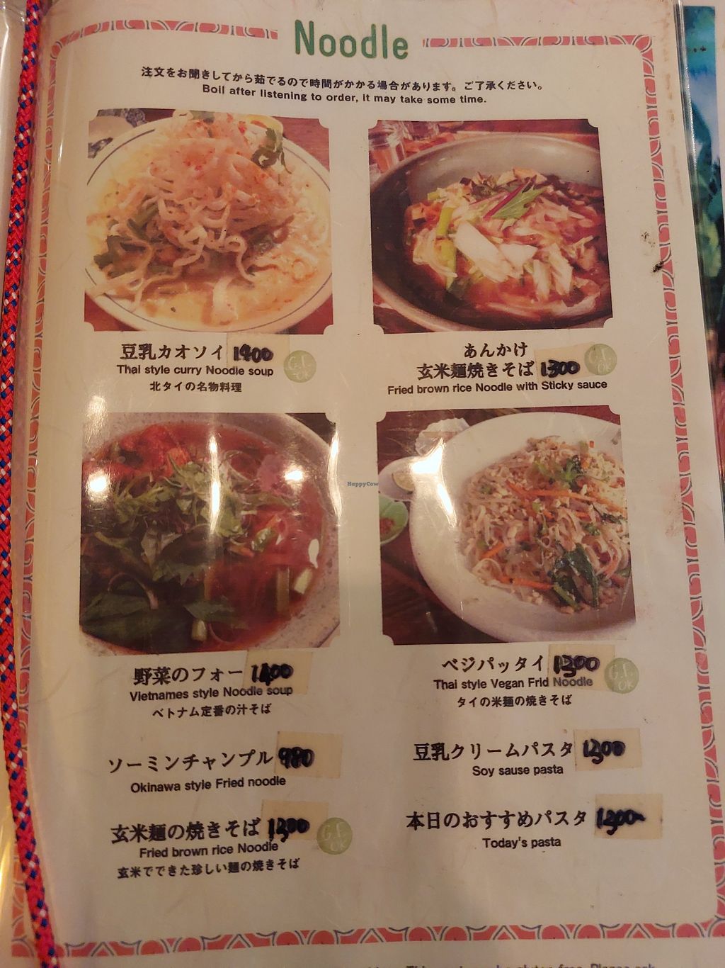 Read moreThere’s a basic English menu and several choices for lunch- curry, noodles and the daily special. The daily special included rice, soup, soy cutlets, veggie tempura, green salad and 3 or 4 marinated vegetable side dishes.