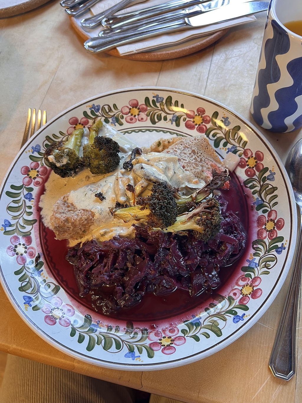 A small organic Shop and café with three tables and a vegan menu. Everything is cooked exclusively vegan, and it was wonderful. It left me very full — beetroot soup, salad, and filled crêpes with vegetables and red cabbage as a side dish. The coffee with oat milk and the quinoa cake perfectly rounded off my lunch.