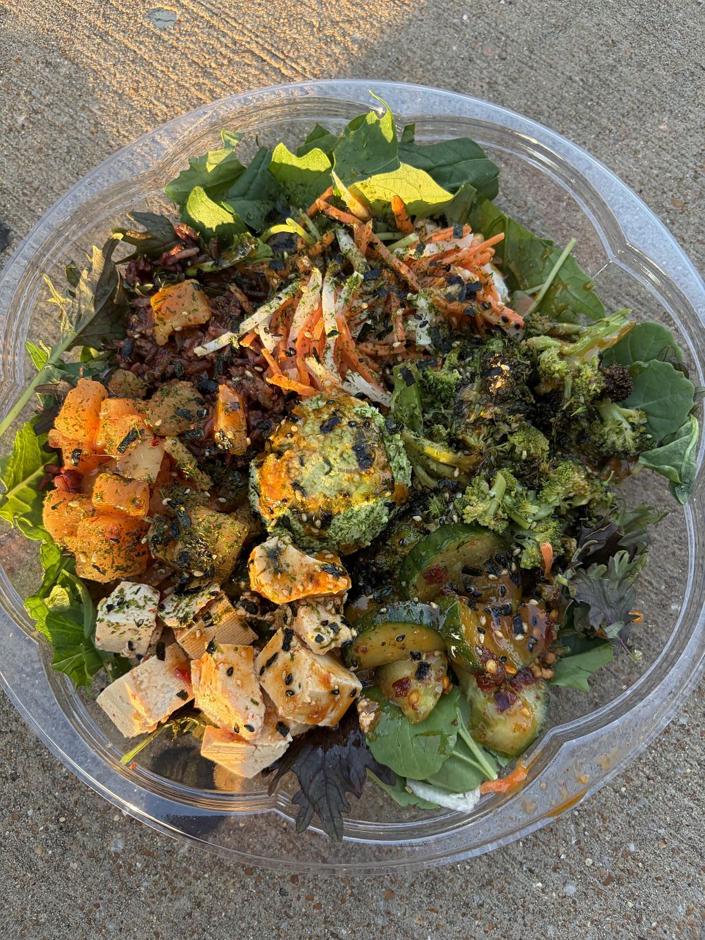 Serves meat, vegan options available. Fast casual restaurant with customizable, made-to-order salad and grain bowls. Vegan add-ins include farro, cucumber, celery, tomatoes, roasted cauliflower and more. Open Mon-Sun 11:00am-8:00pm.