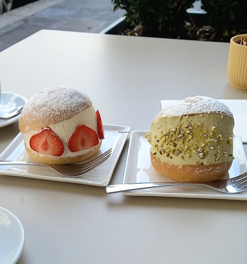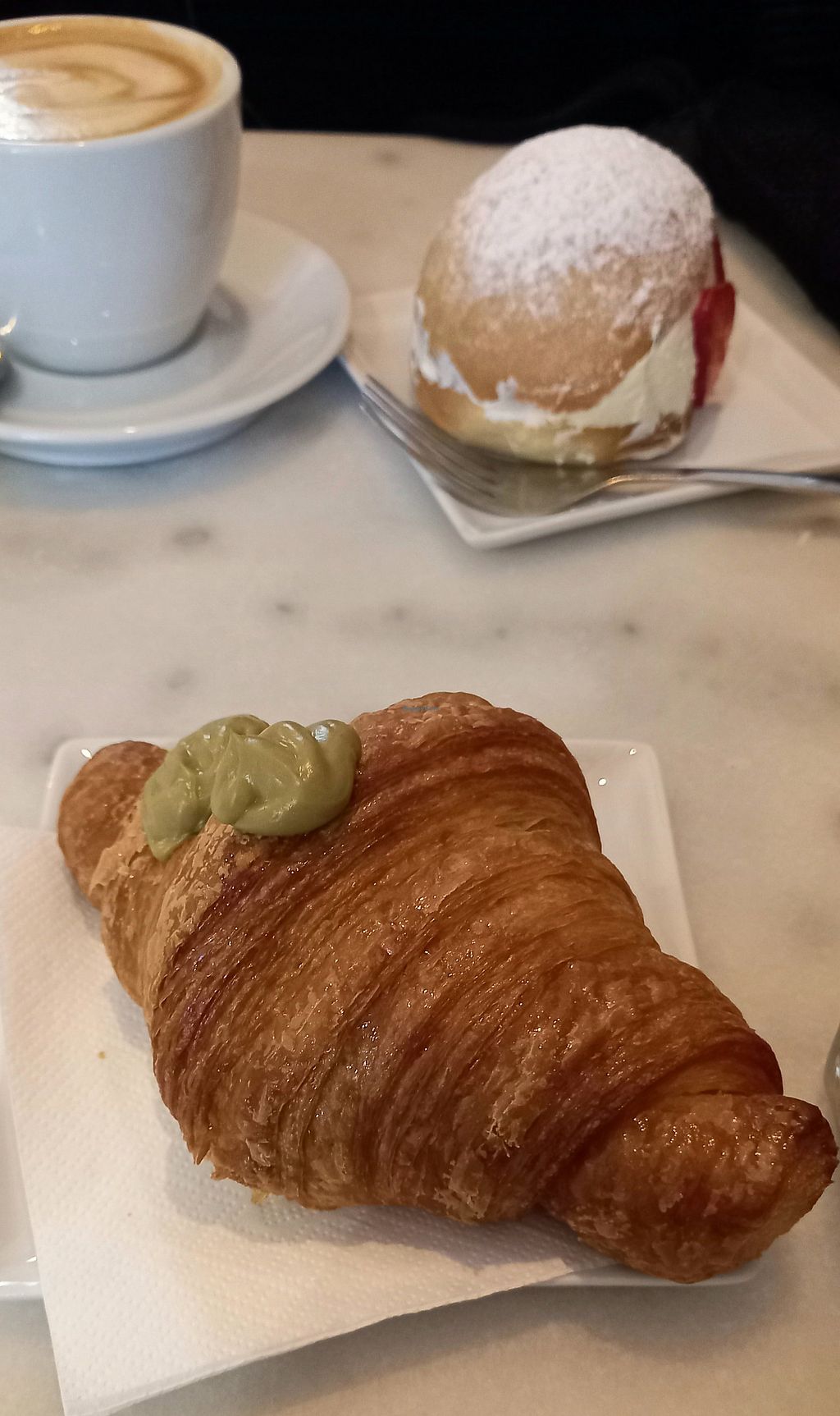 Read morehere you can see two vegan brioches: one filled with chocolate and the other one with cream, a vegan pistachio maritozzo and a vegan cappuccino.