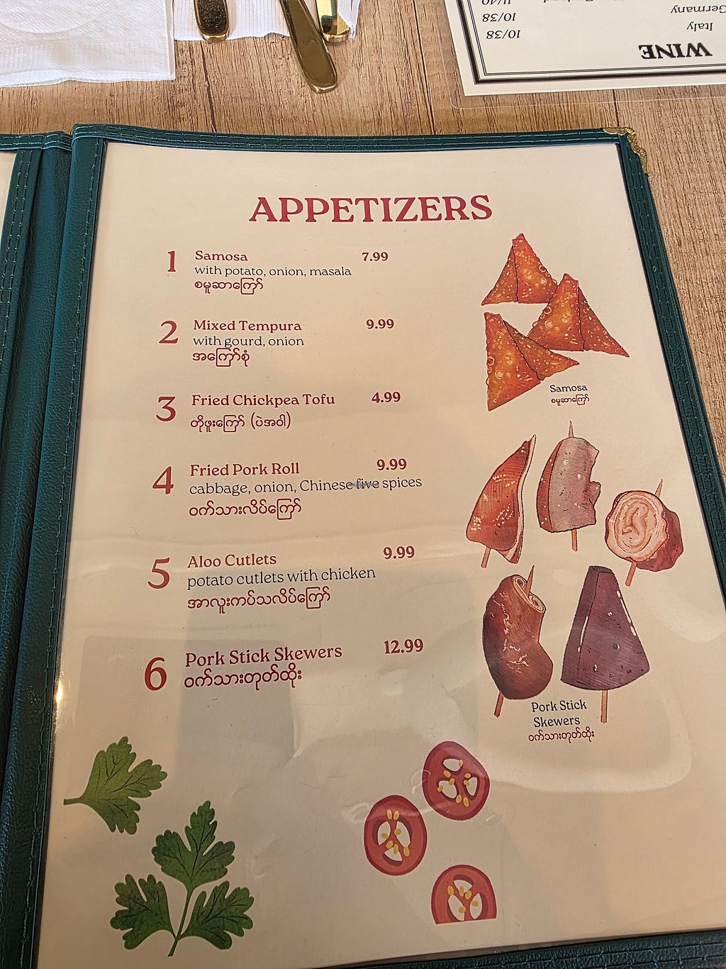Serves meat, vegan options available. Mother-and-daughter-owned restaurant offering authentic Burmese flavors. Vegan options include samosas, fried tofu, and noodles with tofu. Open Mon 4:00pm-7:00pm, Tue 11:00am-2:00am, Wed-Fri 4:00pm-8:00pm, Sat-Sun 4:00pm-9:00pm. Closed Mon.