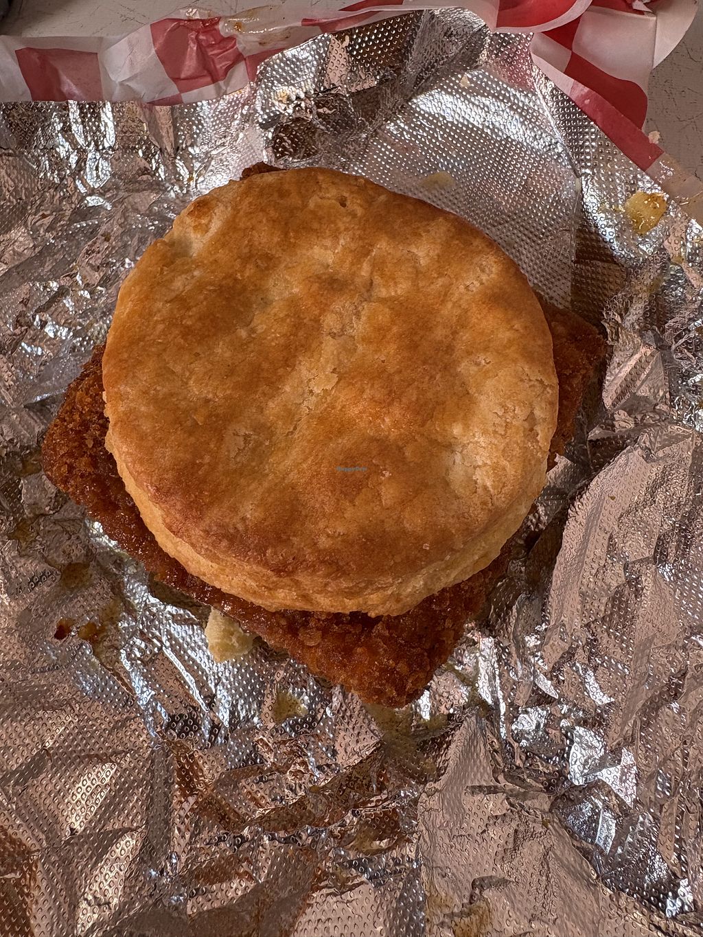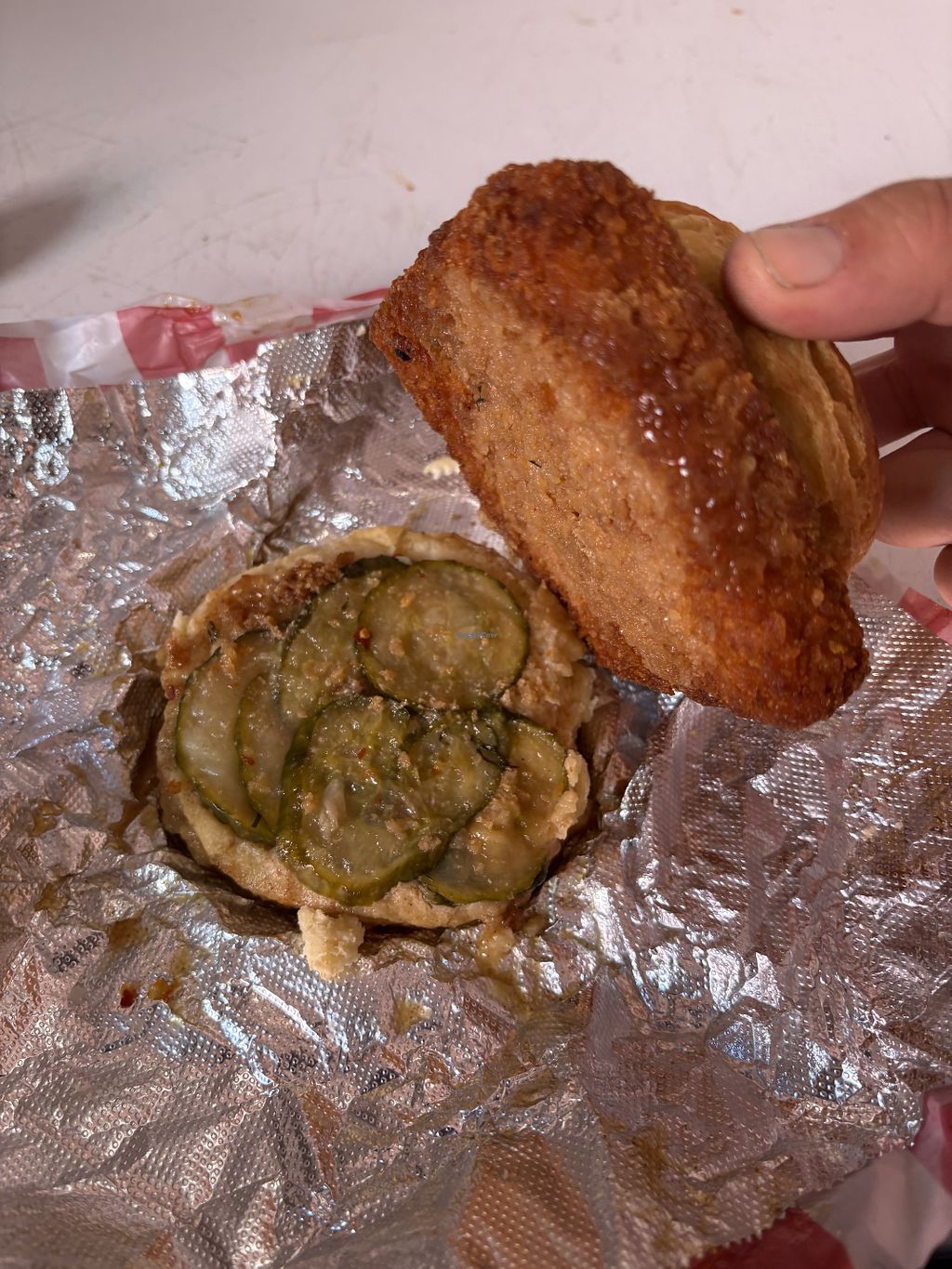 1st time here. Easily found free parking right outside. It’s takeout or pick up only! I wasn’t sure how this meal was going to turn out because any vegan biscuits I have had in the past have been dense and heavy. I am very happy to share that these biscuits were soft and delicious. I ordered the Chicky Baby (my top choice) and the wrangler (employees choice). The wrangler is something I am used to as far as flavors go. A spicy chorizo and beef patty with cheese, just egg, and chipotle mayo. It had a nice kick, flavorful, and worth getting. The Chicky baby was more of a surprise with the sweet and spicy pickles and house hunny mustard. Definitely my favorite. What I loved most about it is the fact that the house made Fried Chick’n was crispy from the 1st bite to the last - never became soggy. Would love to come back here again.