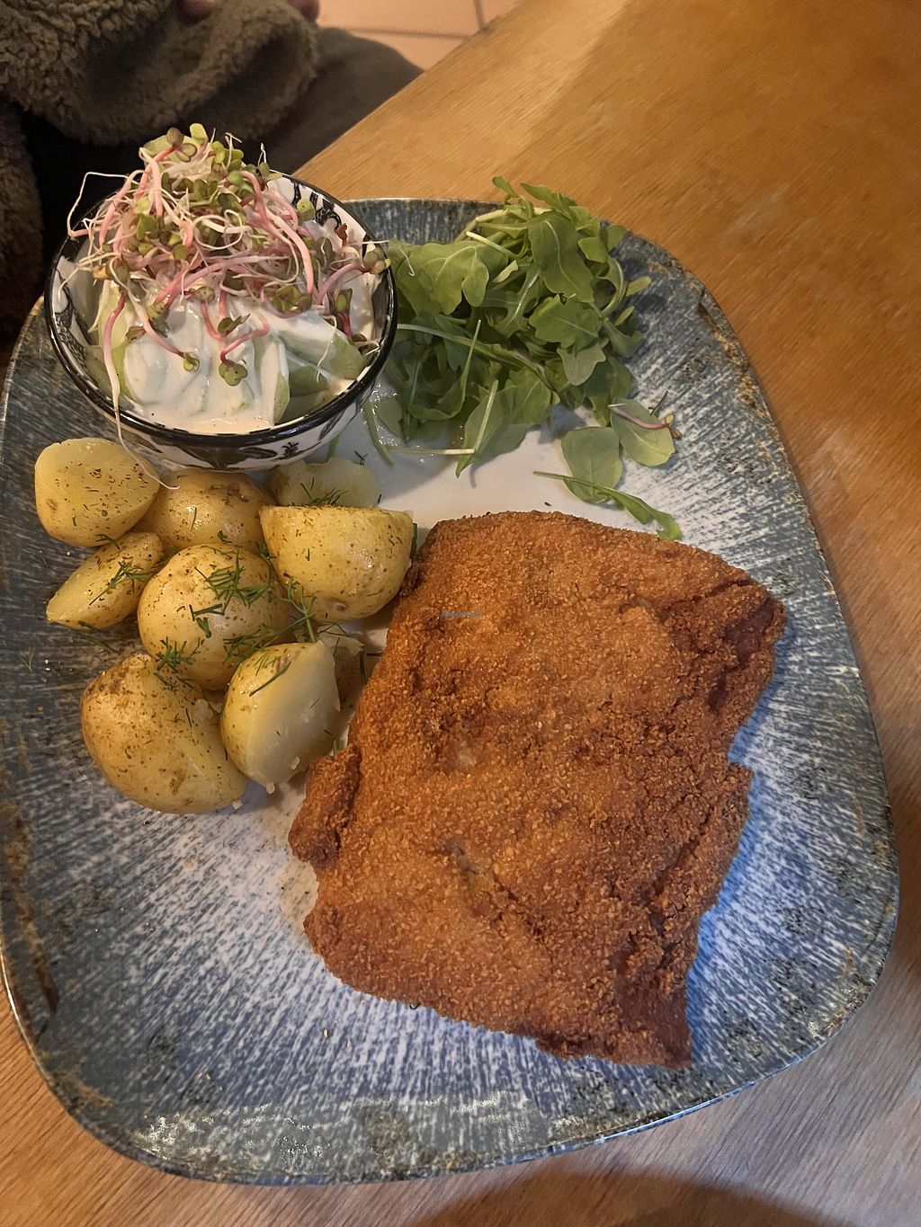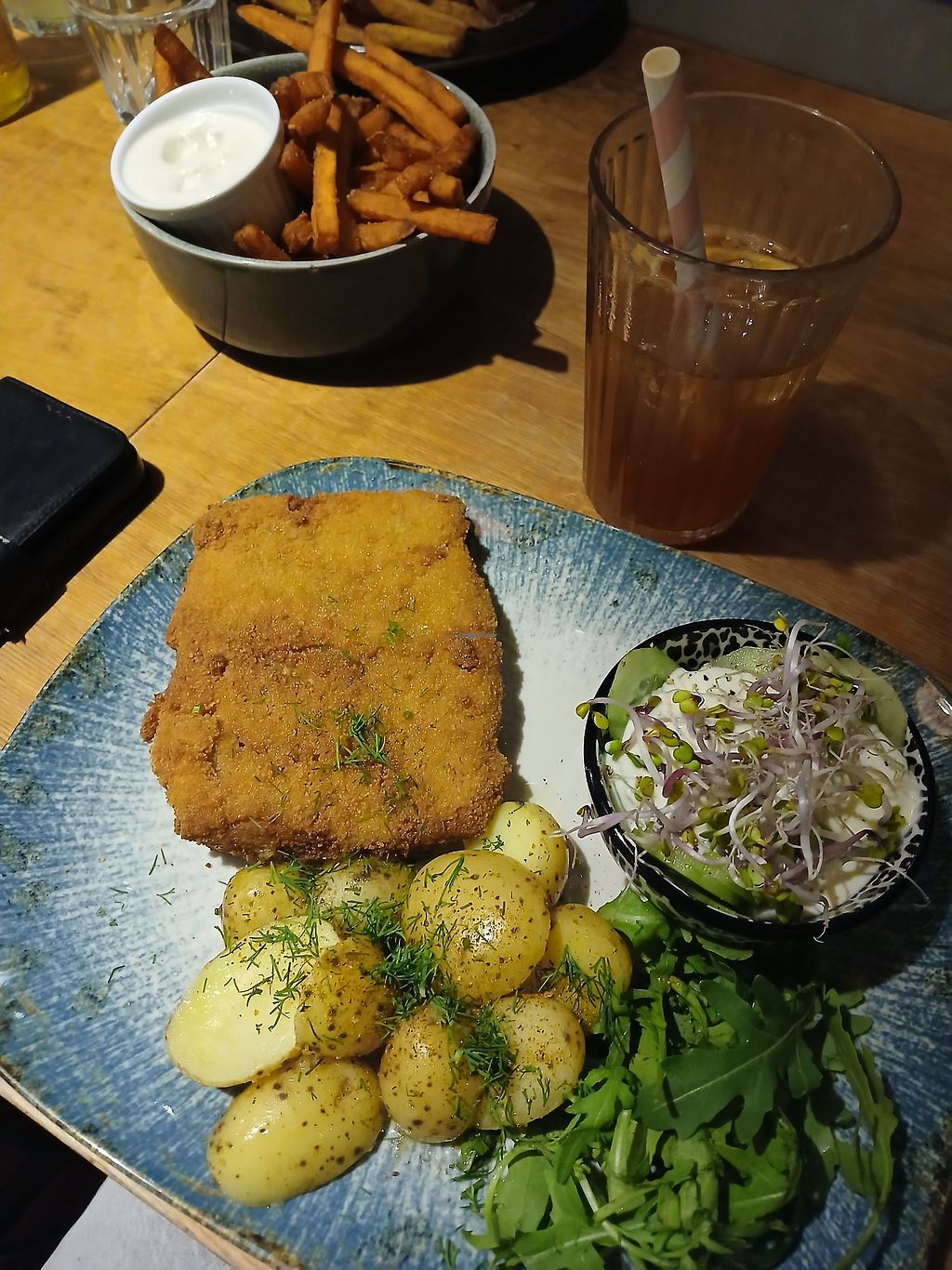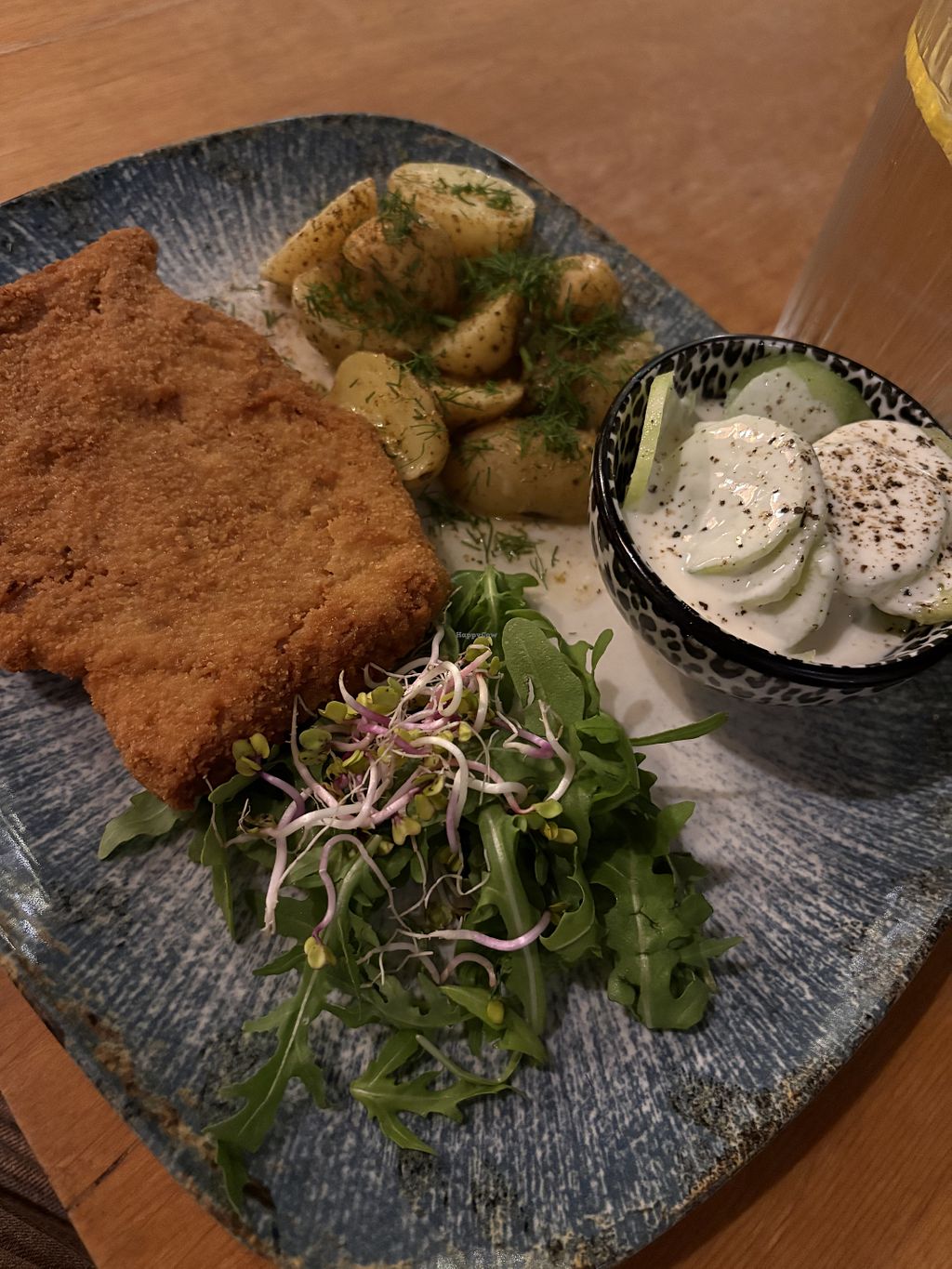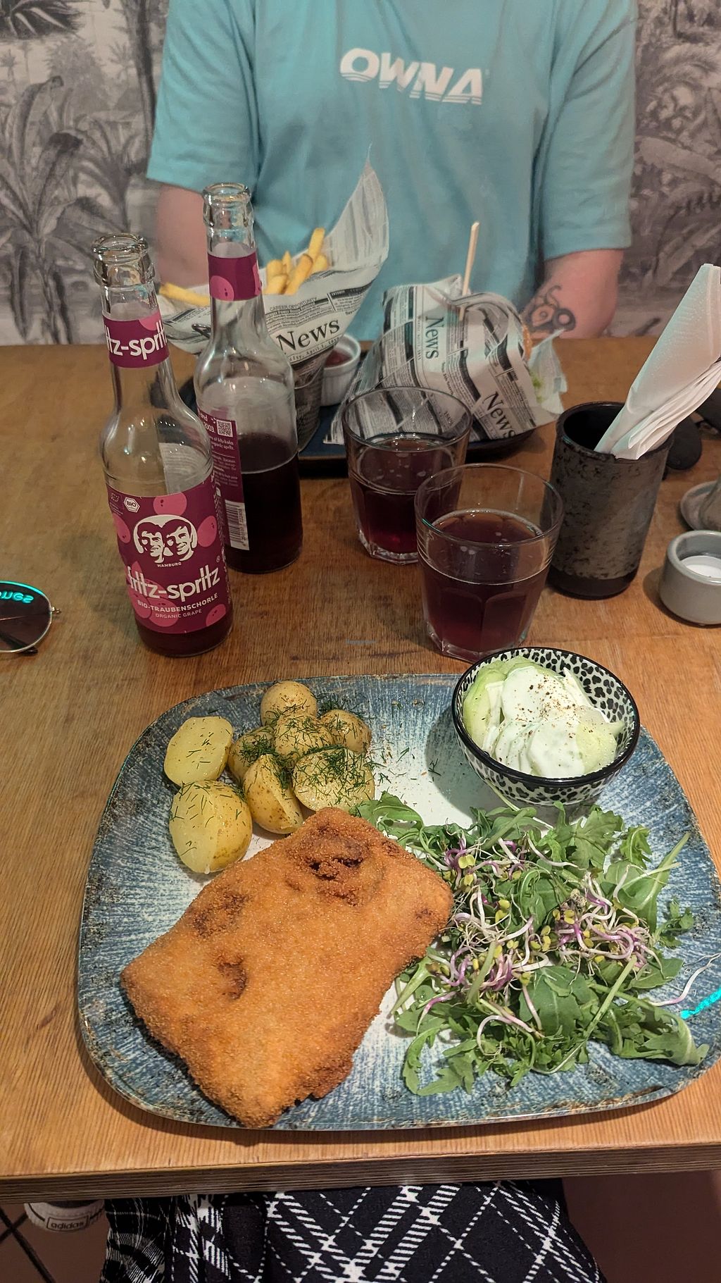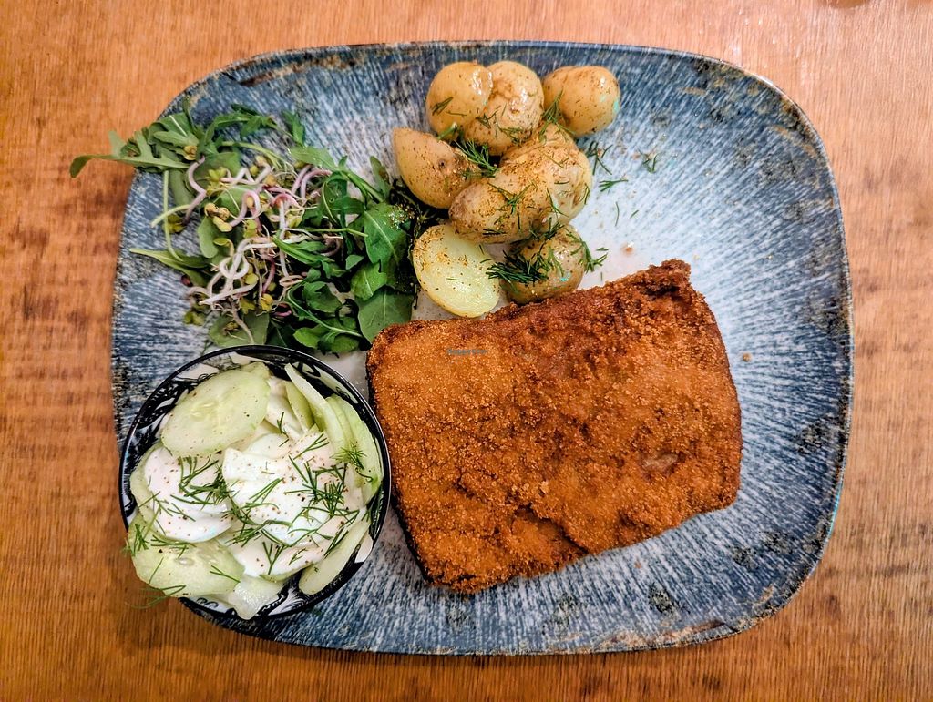 Read moreFor mains, we shared the “Classic Polish Pork Chop”—a clever twist featuring a breaded soy cutlet, creamy potatoes, cucumber with cream, and fresh sprouts. Comfort food at its finest. Though the “No Fishbones” wasn’t available, the panko-crusted “chickless” cutlet was a worthy substitute. Served with crisp summer salad and a zingy tartar sauce, it was fresh, crunchy, and satisfying.