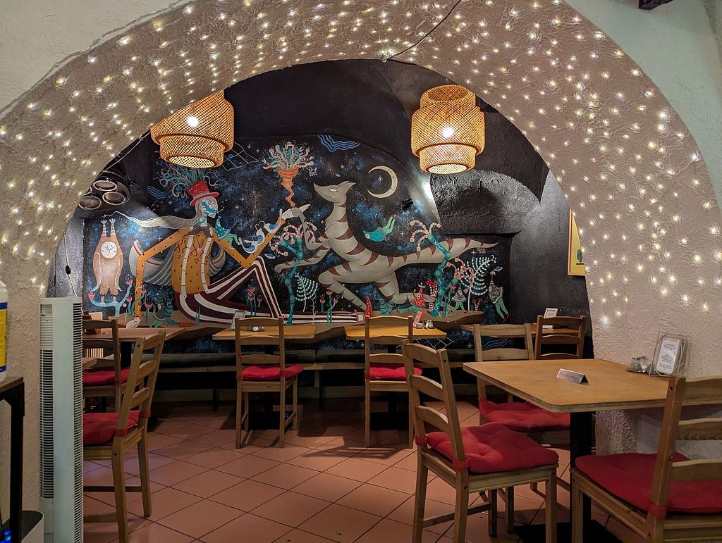 The place is hidden in a narrow corridor but colourful stickers lead the way. The food was great, we loved especially the mushroom soup.