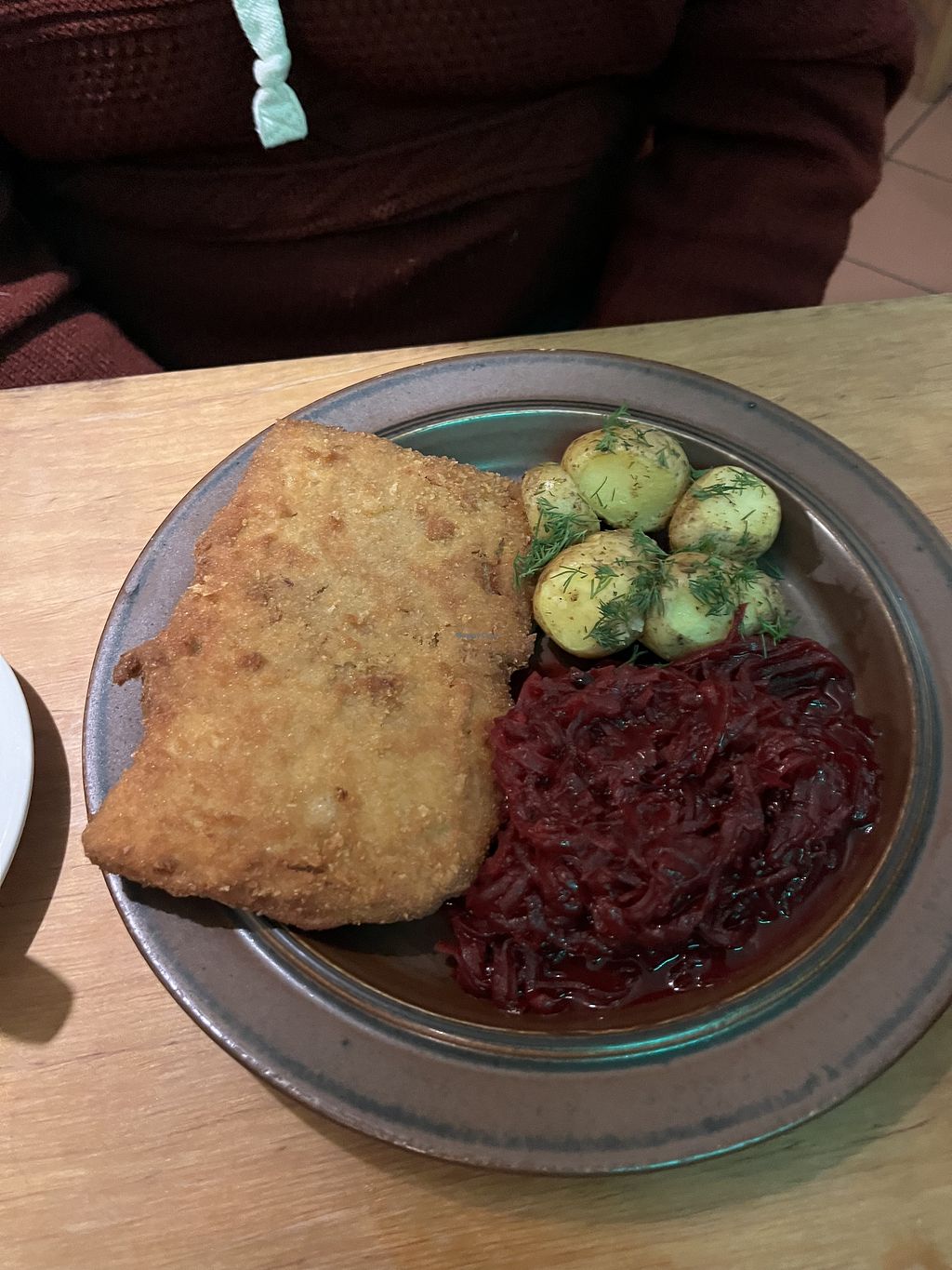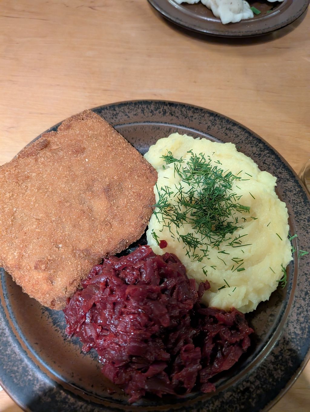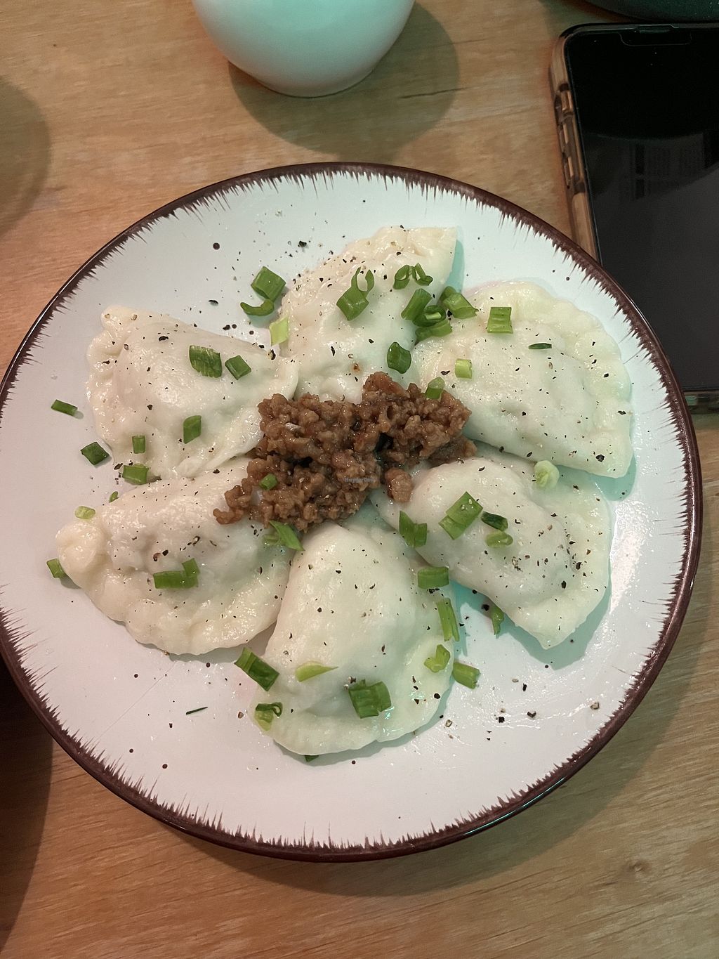 Boneless fish, pierogies and burger. SO GOOD 🤤