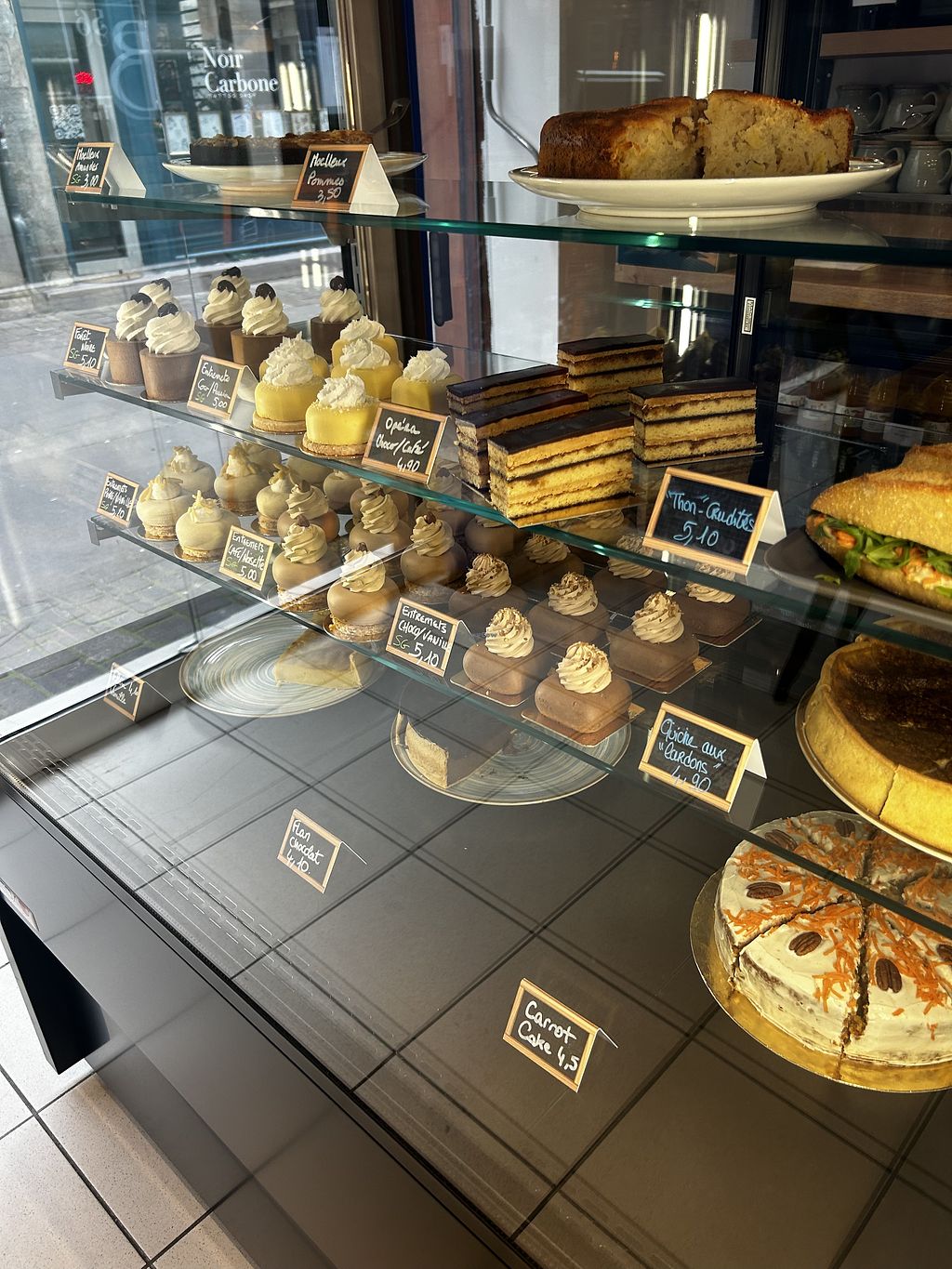 Everything was super tasty! There was only one salty option—a vegan quiche Lorraine—which was excellent, though I would’ve loved a simple green salad on the side (it was Sunday, so choices were limited). On the sweet side: from chunky carrot cake to refined desserts and chewy cookies, the variety was perfect. A cute little spot to enjoy a cozy afternoon treat!