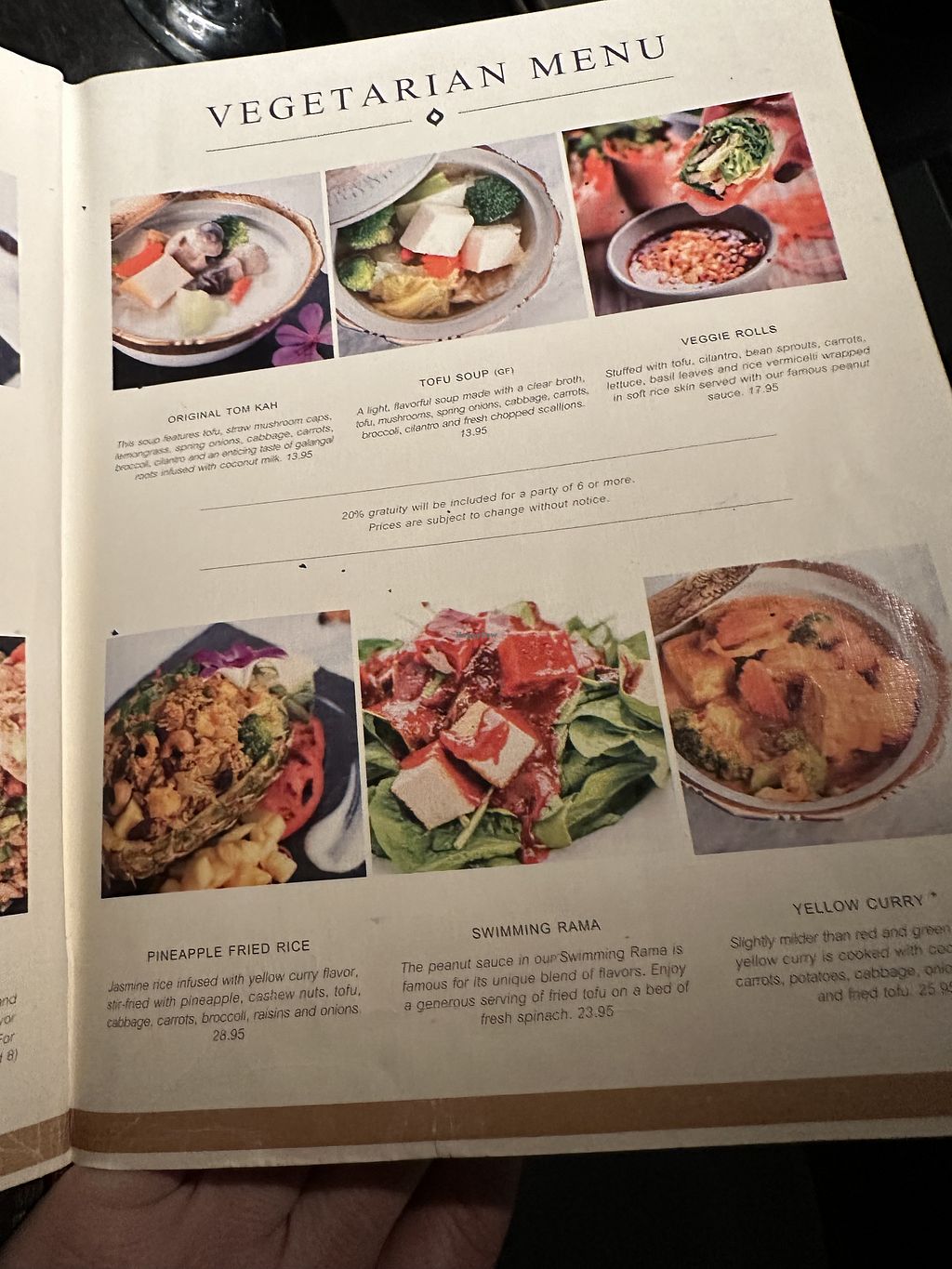 Happy Hour from 4-6PM is the best time to go. The Tom Kah soup and red and yellow curries are on the menu there and able to be subbed with tofu. The smaller portions will allow you to try each without breaking the bank or ordering too much food. Had the salted mixed nuts but it was just cold and wet diced bell peppers in a bowl with peanuts and cashews. Not a great mix, and expected more from it as an appetizer.