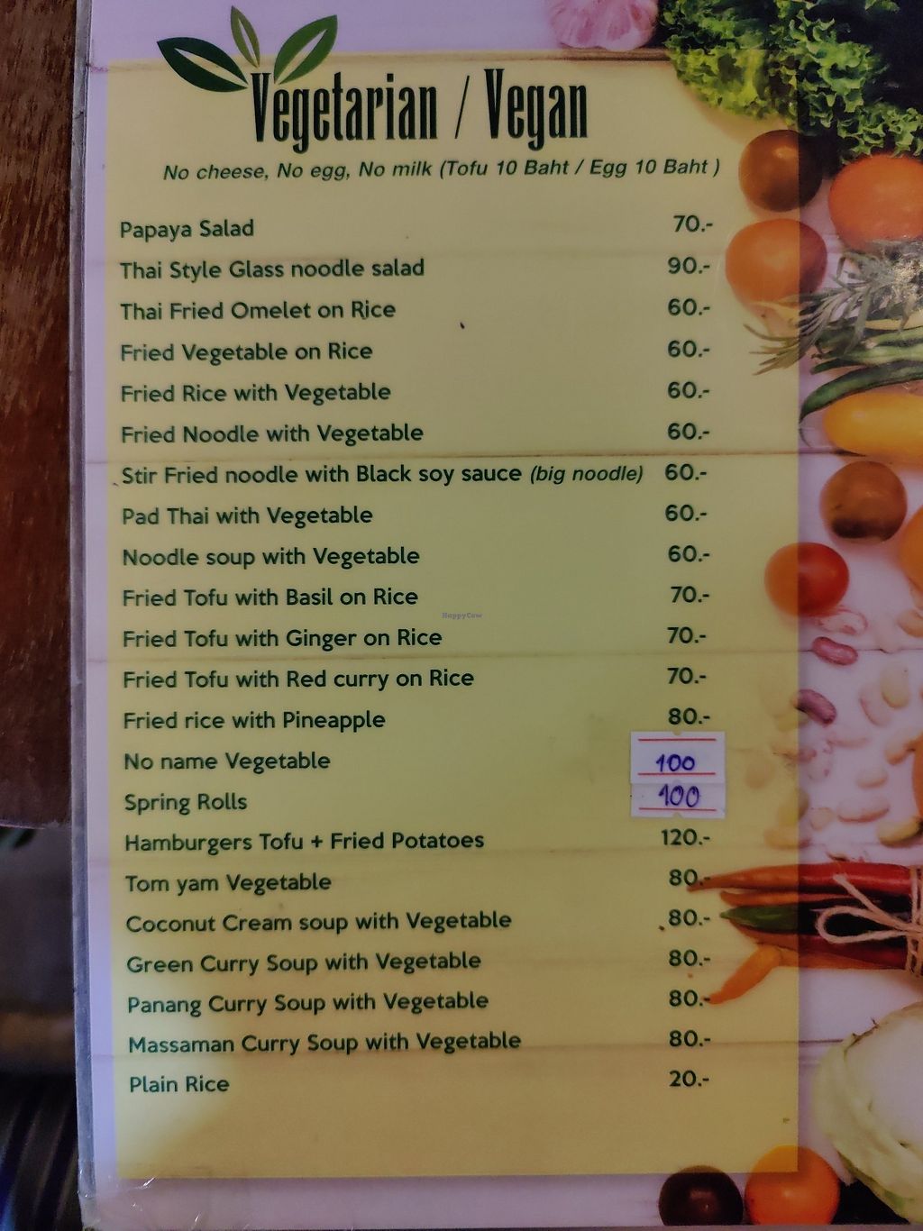 The lady is nice and the food is good. There is an entire pages for vegan and vegetarian dishes. I got a Tofu burger with fries for 100 baht..not the best in the world, bur tasty enough ;)