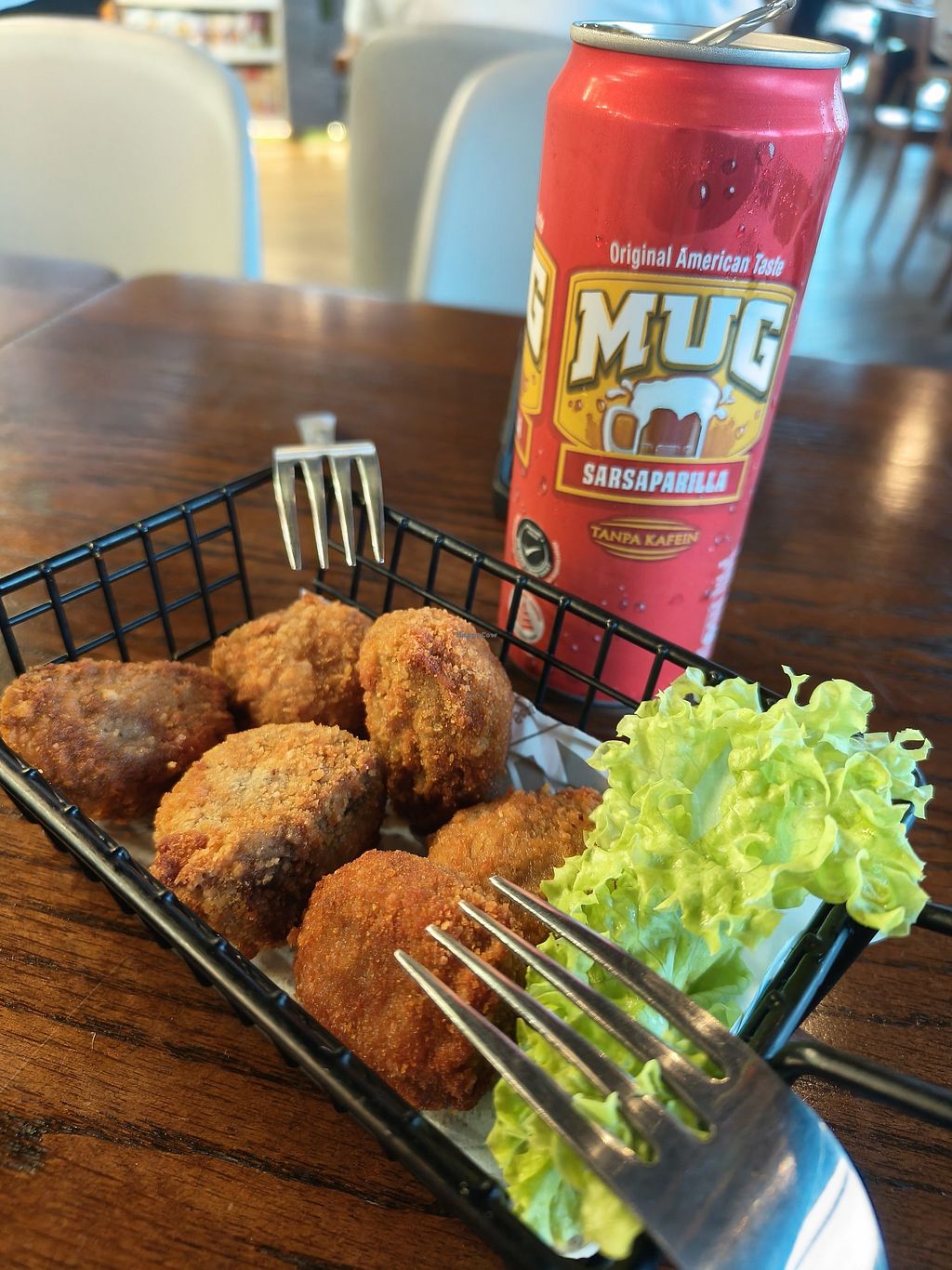 Lion’s Mane Burger with fries, salad and lemon passion fruit tea