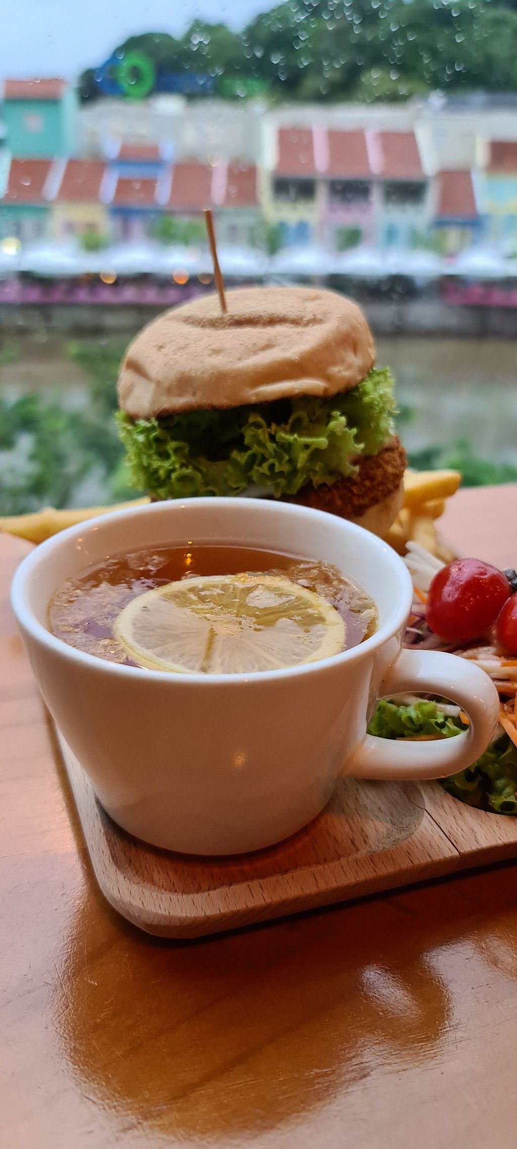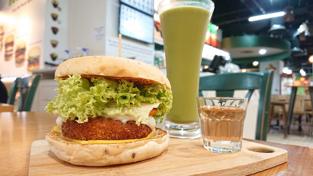 potato croquette burger with cheese, fruit vinegar, iced matcha latte