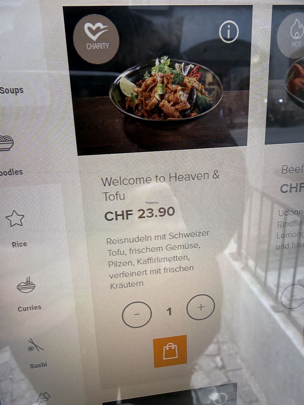 Huge variety of Asian vegan options including sushi, hot dishes, tempura and desserts. We were seated, ordered and served in a very timely manner and our waiters were friendly and spoke English. The restuarant is also huge. We ordered the tempura edamame with sweet potato, the momos and the sweet and sour “chicken” dish. All super delicious! Expensive but that’s Switzerland.