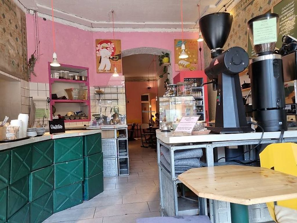 Coffee shop that serves sandwiches, salad bowls, smoothies, and daily selection of baked treats like banan bread, croissants, cakes, and nut balls. Offers plant milk alternatives for beverages. Reopened summer 2020 with menu now being all-vegetarian and mostly vegan. Open Mon-Fri 08:00-18:00, Sat-Sun 09:00-18:00.