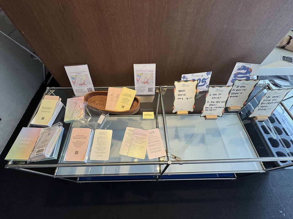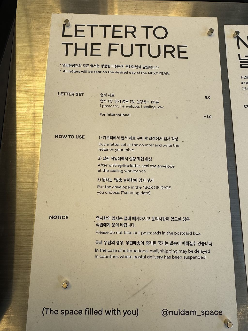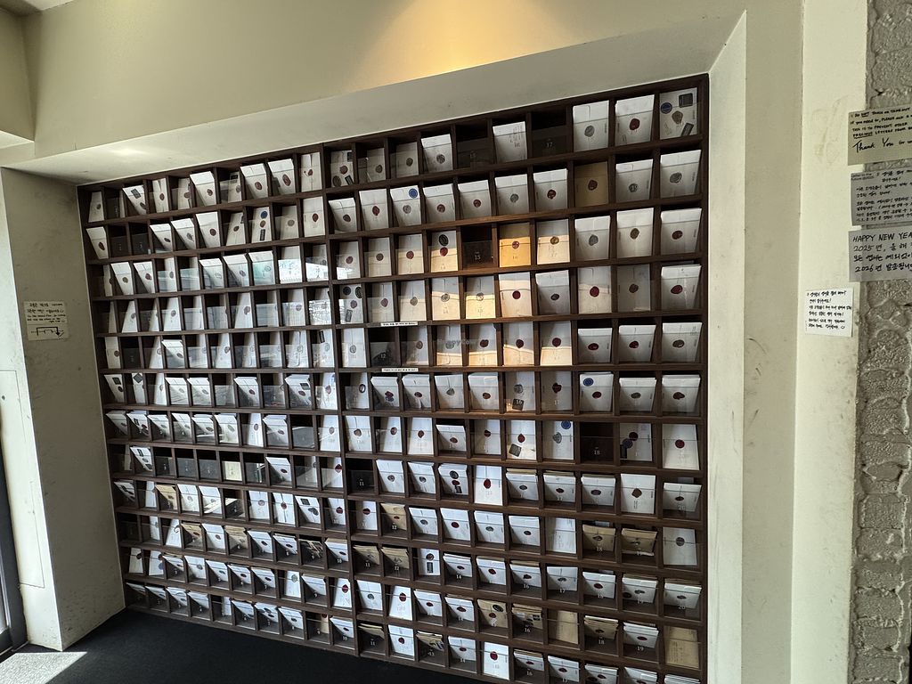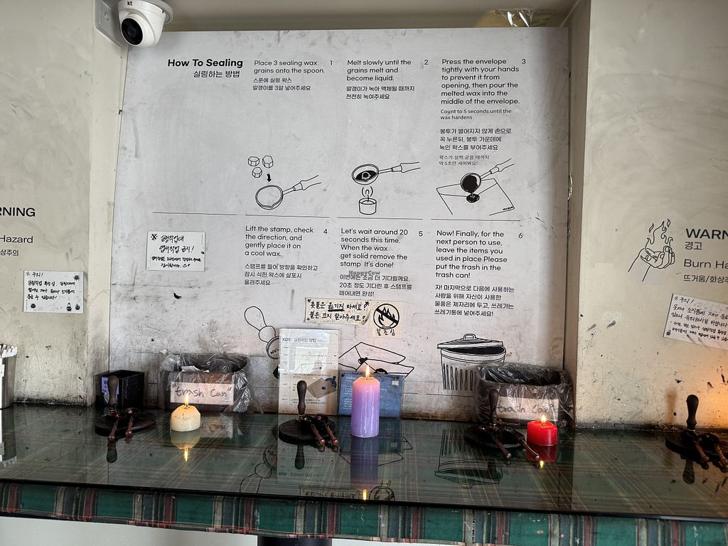 It's a little hike up the slopy roads of Haebangchon to get to this cafe, which is located in a corner building. The cafe occupies 3 floors (including an outdoor roof top). The counter and seal-your-letter area are on the first floor. For additional seating, one needs to go up a narrow staircase, which is behind another door outside. The cafe was surprisingly full, their main customers being young women and couples.