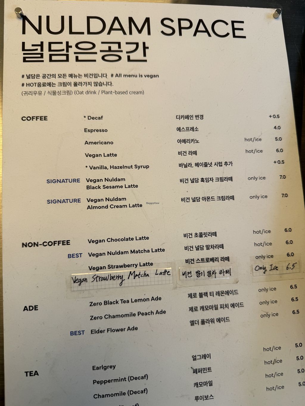 Here's another vegan cafe of Nuldam, a company which produces various desserts and has been operating online for years. This branch follows the same concept as the one near Gyeongbok Palace: Simple design, letter activities, all vegan drinks and desserts. The menu seems to change a little bit over time.